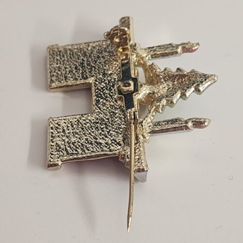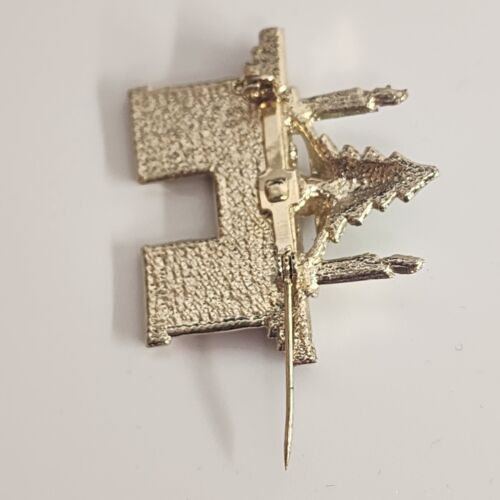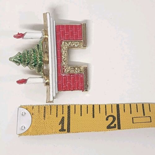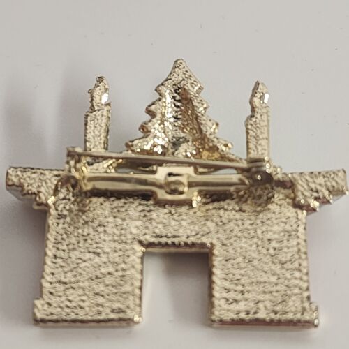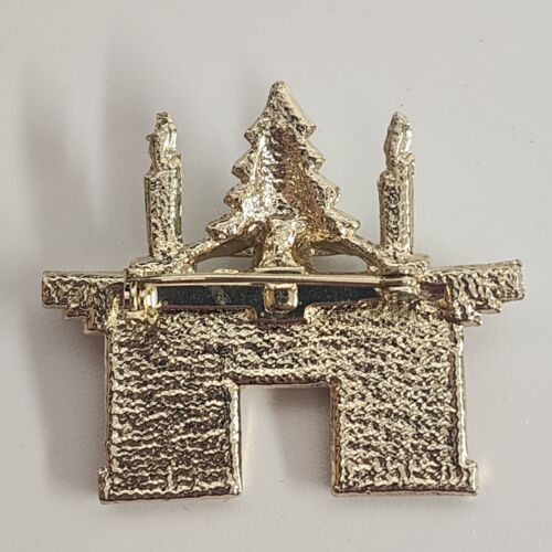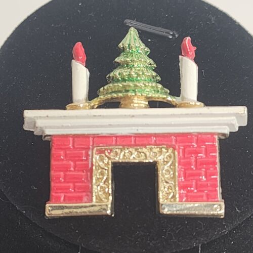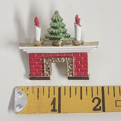 Fireplace Brooch with Christmas Tree & Candles Metal Enamel 2.75" x 1.5"