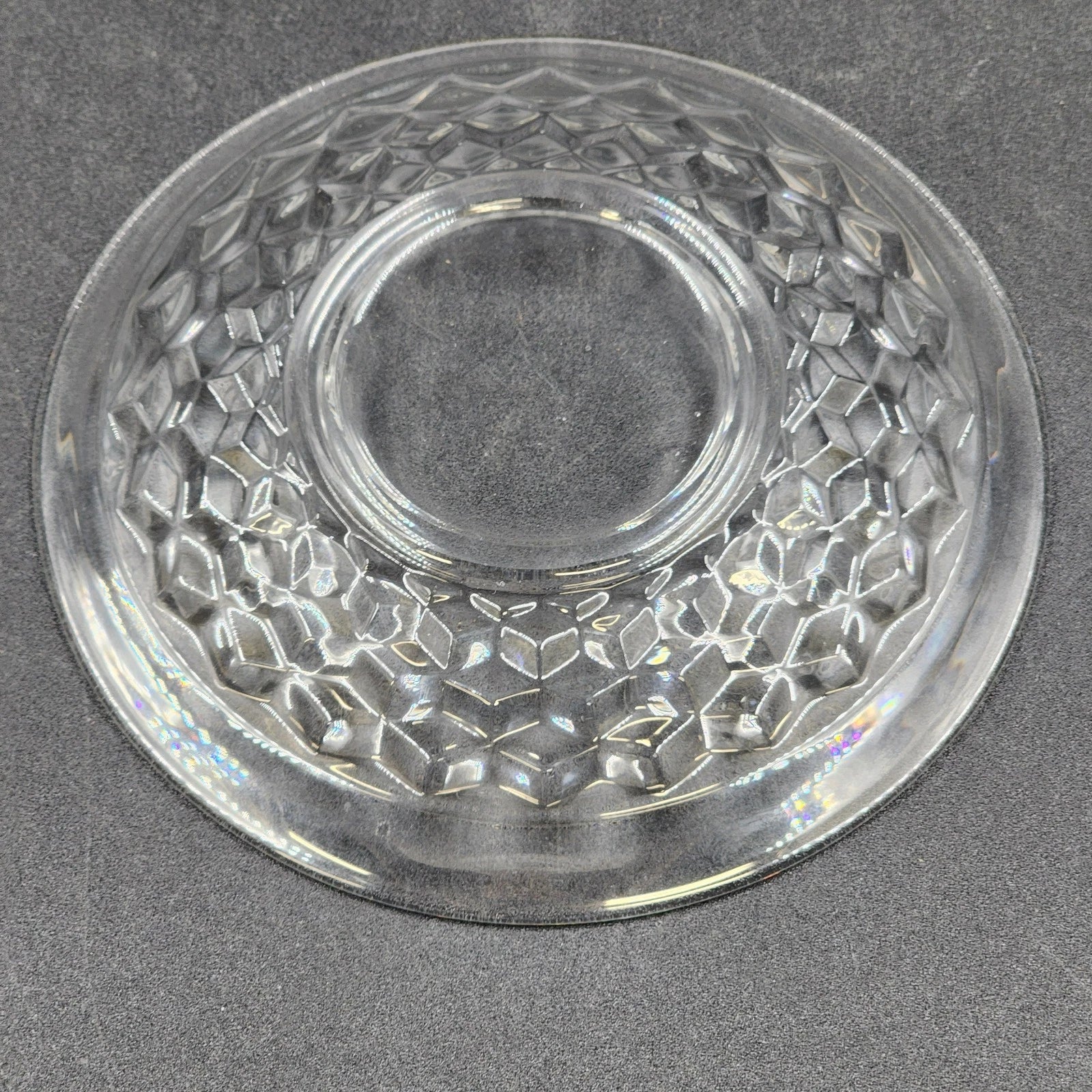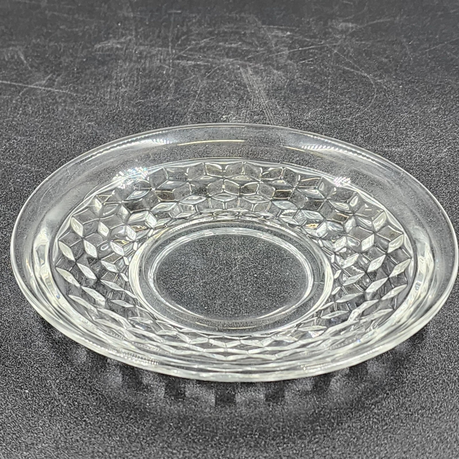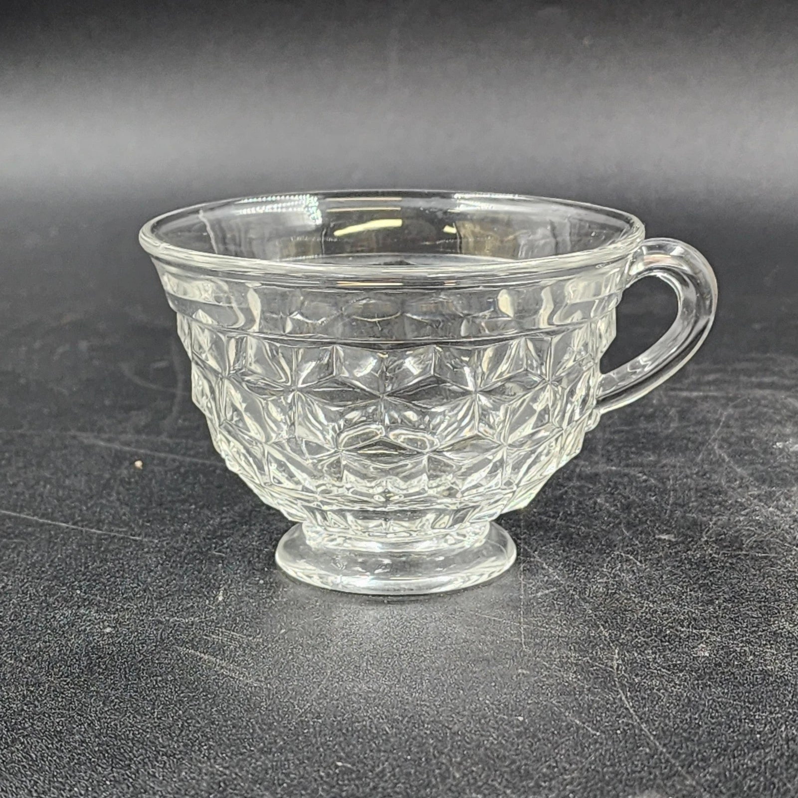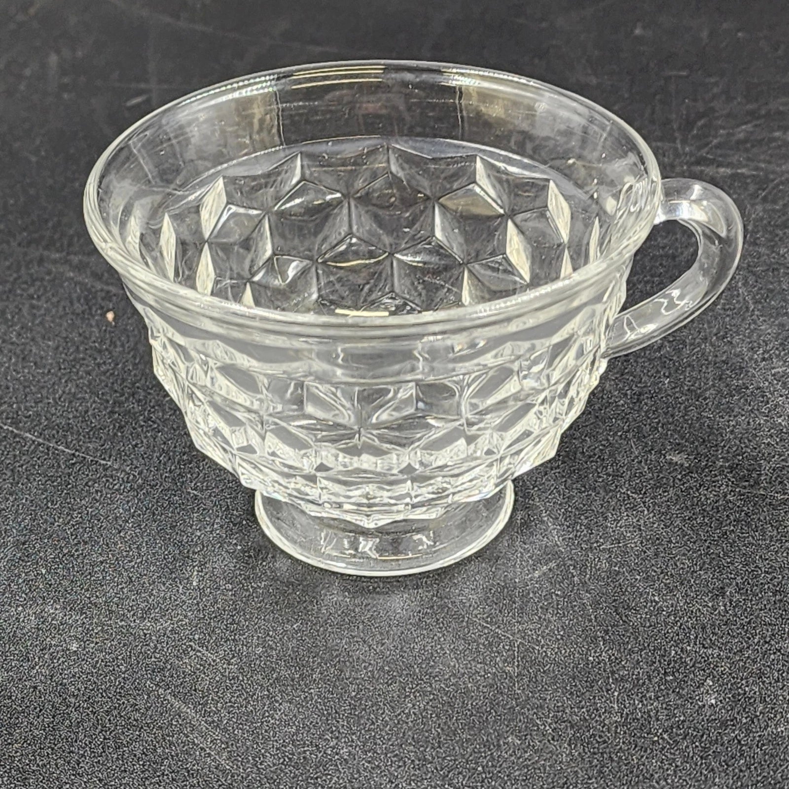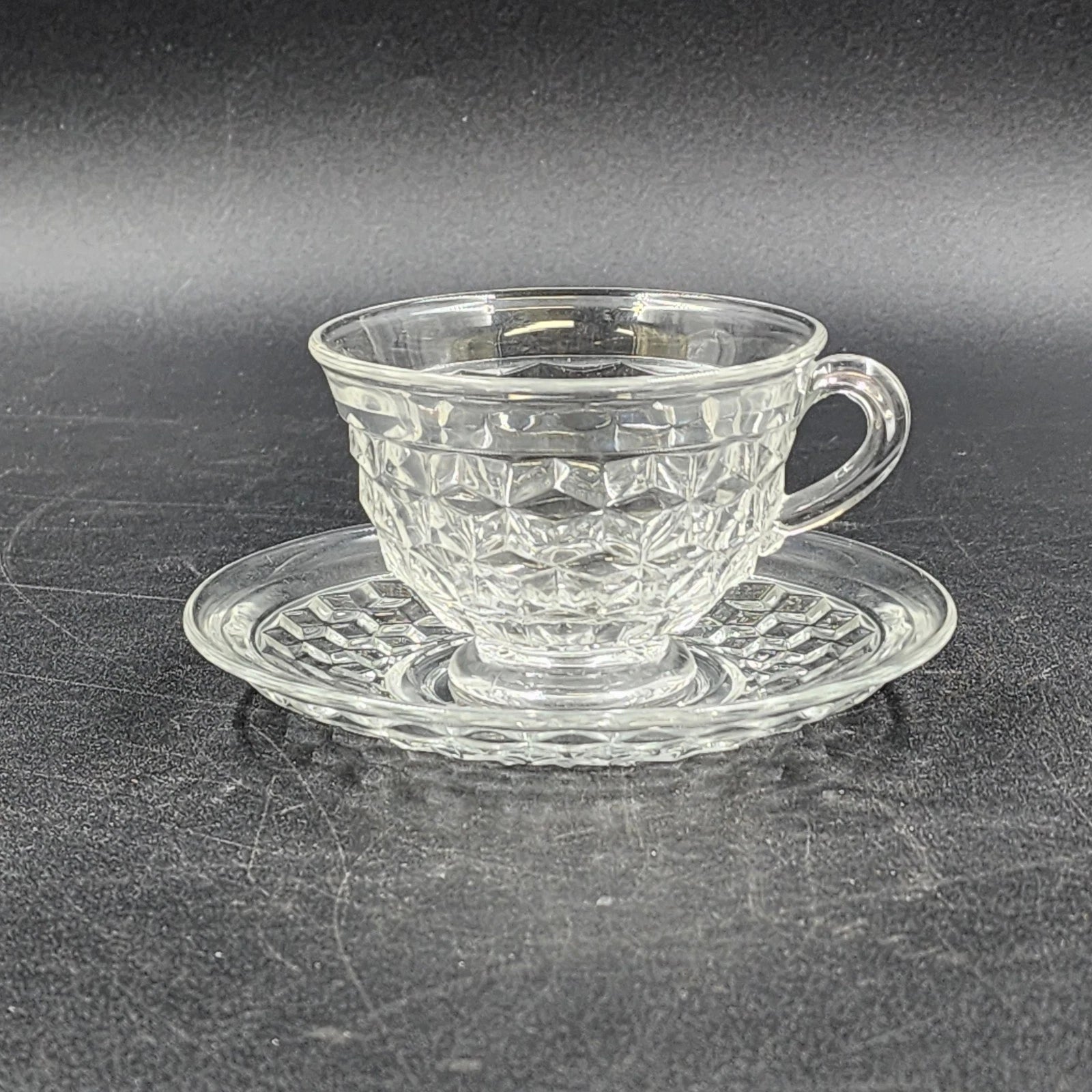 The flared cup and matching saucer are made of high-quality pressed glass with a distinctive cube-cut design that beautifully reflects light. Perfect for elegant coffee service, vintage display, or completing your Fostoria collection.