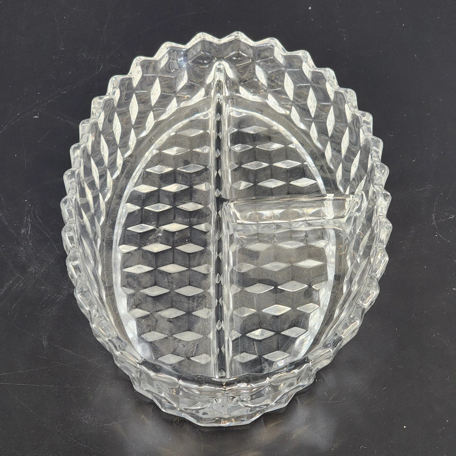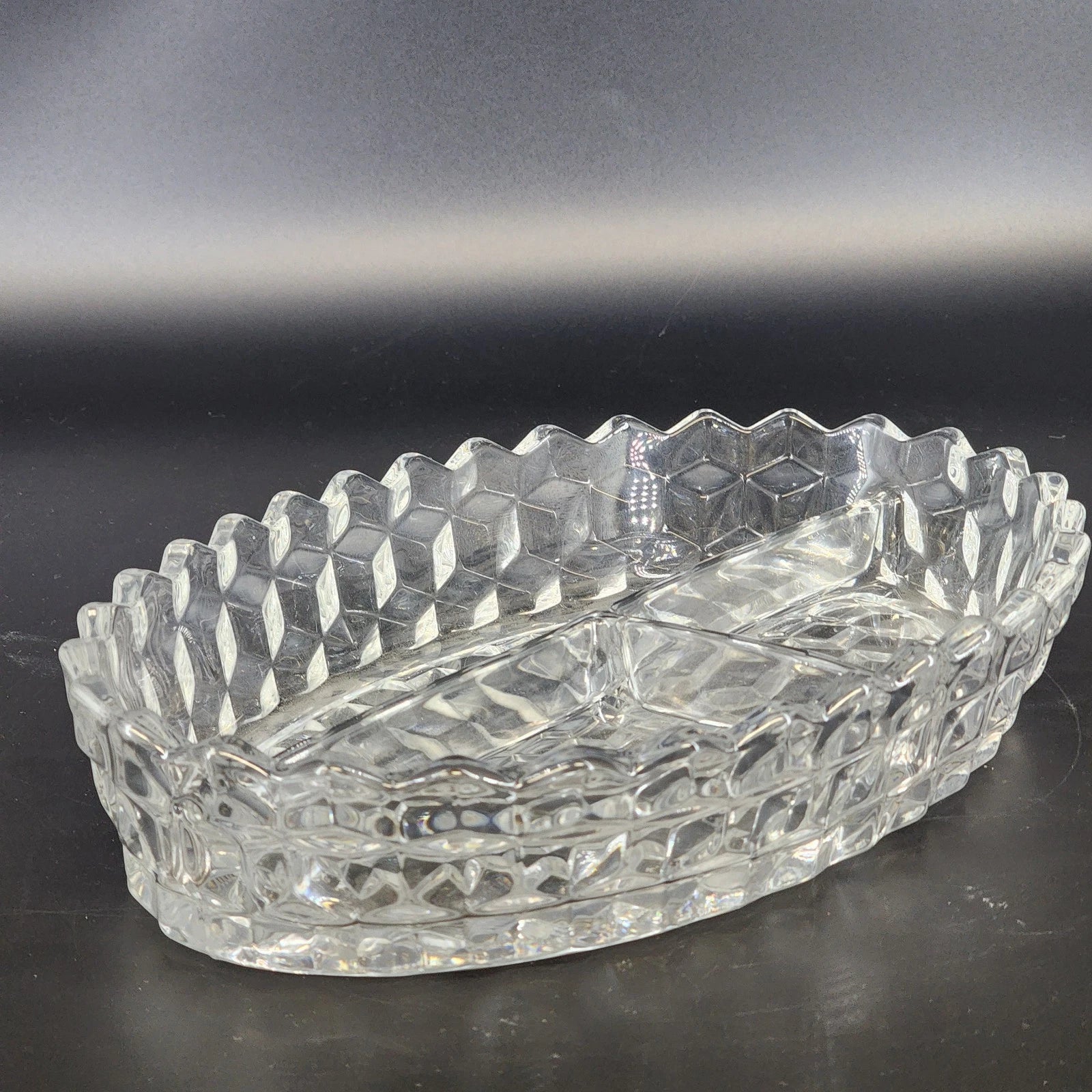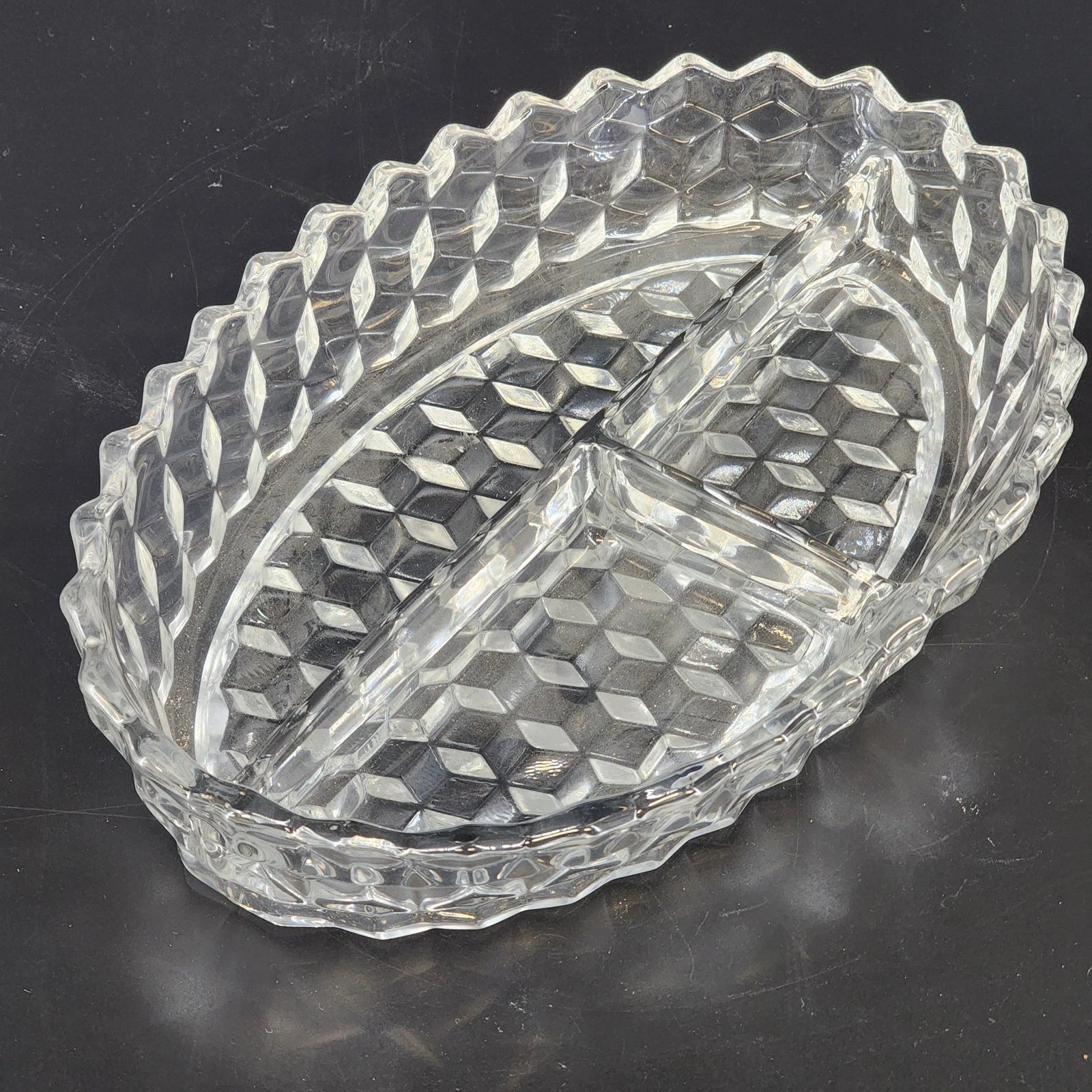 Fostoria American Oval Relish Dish Clear Glass 3-Part Cube Pattern 10.5" Vintage