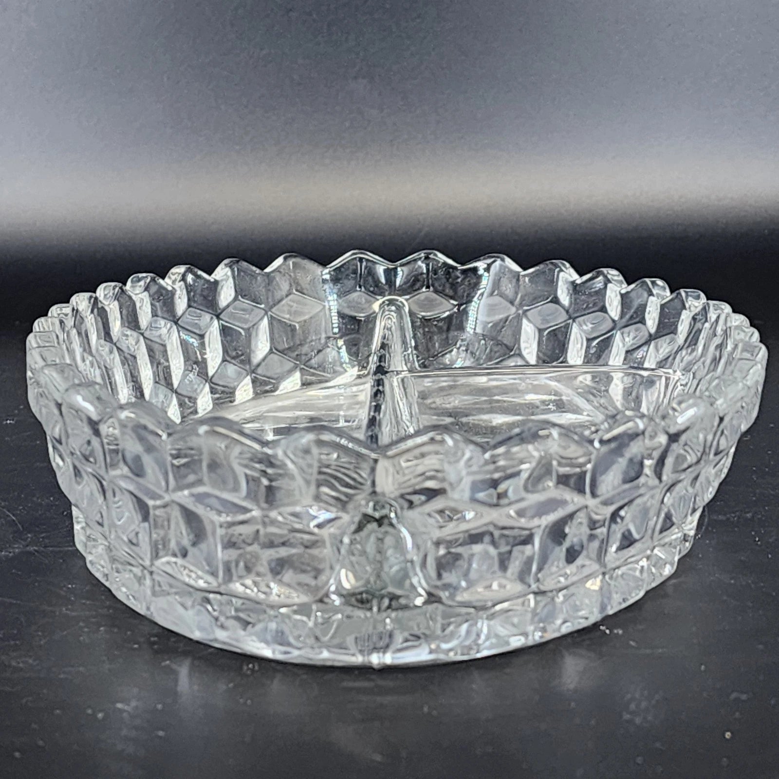 Add a touch of timeless American craftsmanship to your table with this vintage Fostoria 3-part relish dish. Featuring the iconic "American" #2056 pattern, this piece is famous for its stunning cubist, 3D-diamond block design that brilliantly catches the light. This heavy, high-quality pressed glass dish is divided into three sections, making it as functional as it is beautiful-perfect for serving hors d'oeuvres, condiments, or candies. With its elegant scalloped, saw-toothed edges and substantial weight, this Fostoria classic is a cornerstone piece for any collector of mid-century American glassware.