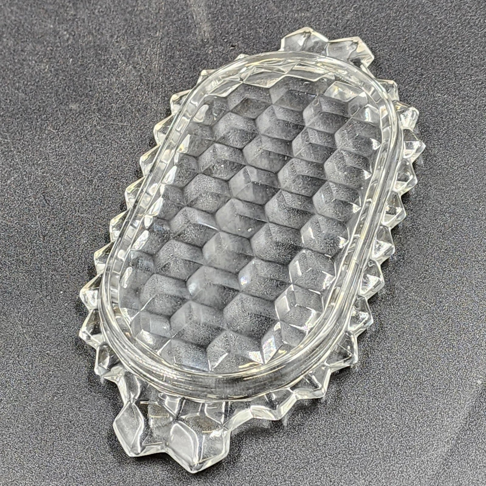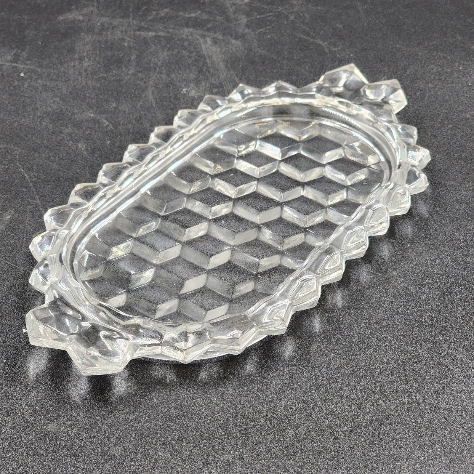 Beautiful Fostoria American Clear 3-Piece Set featuring a creamer, sugar bowl with lid, and underplate in the timeless cubist block pattern (No. 2056). This pattern by Fostoria Glass Company is known for its geometric cube design and sparkling clarity, making it one of the most beloved depression-era glassware patterns.