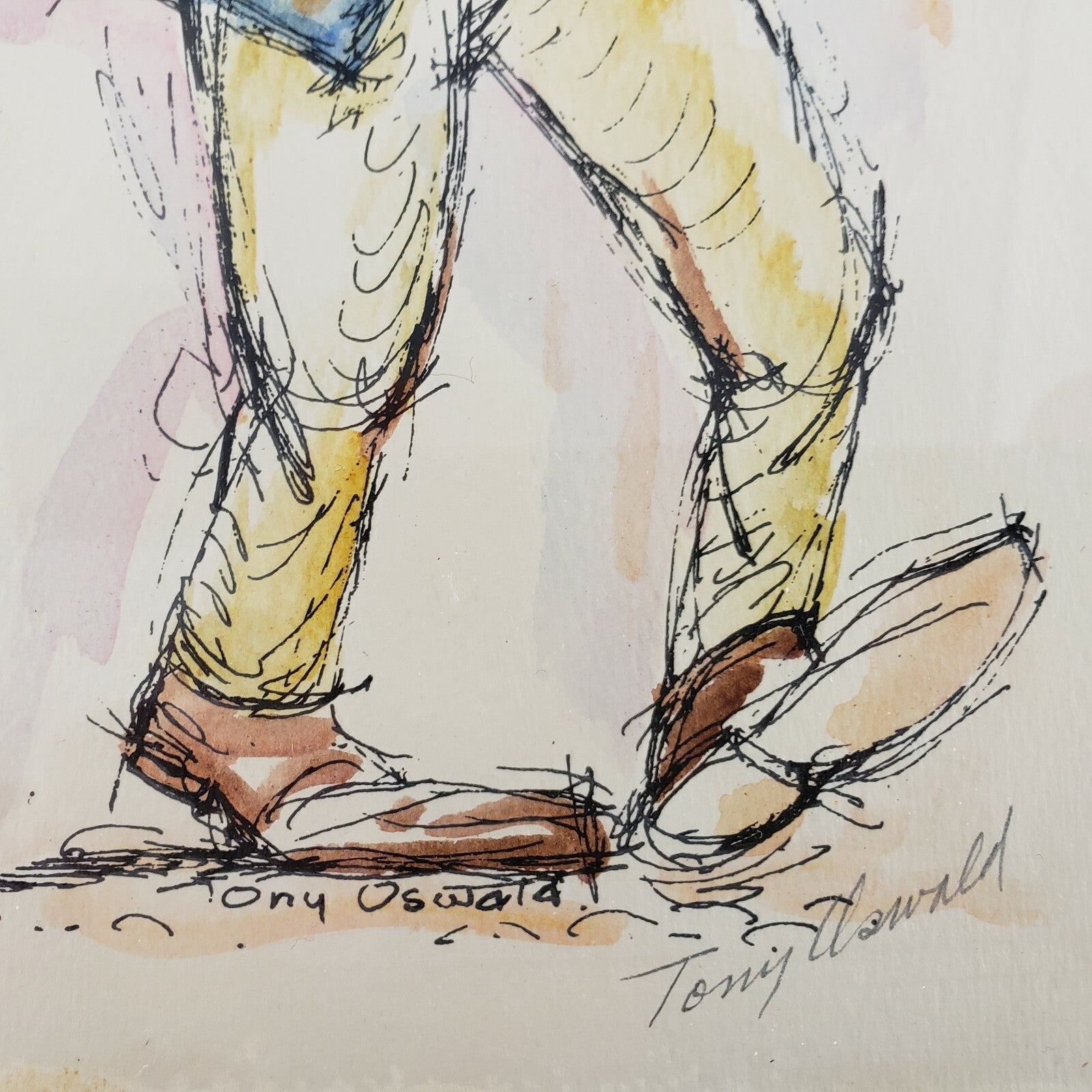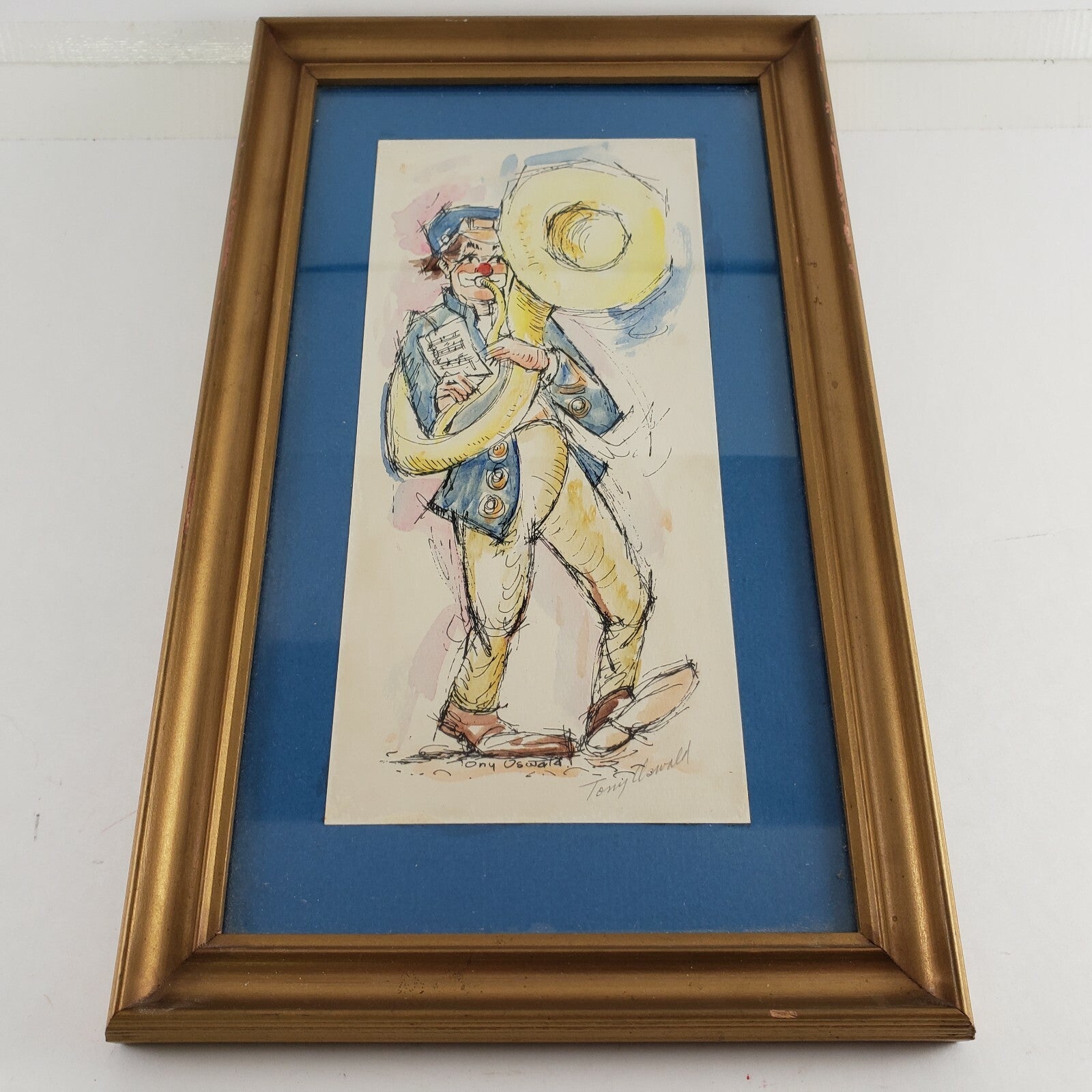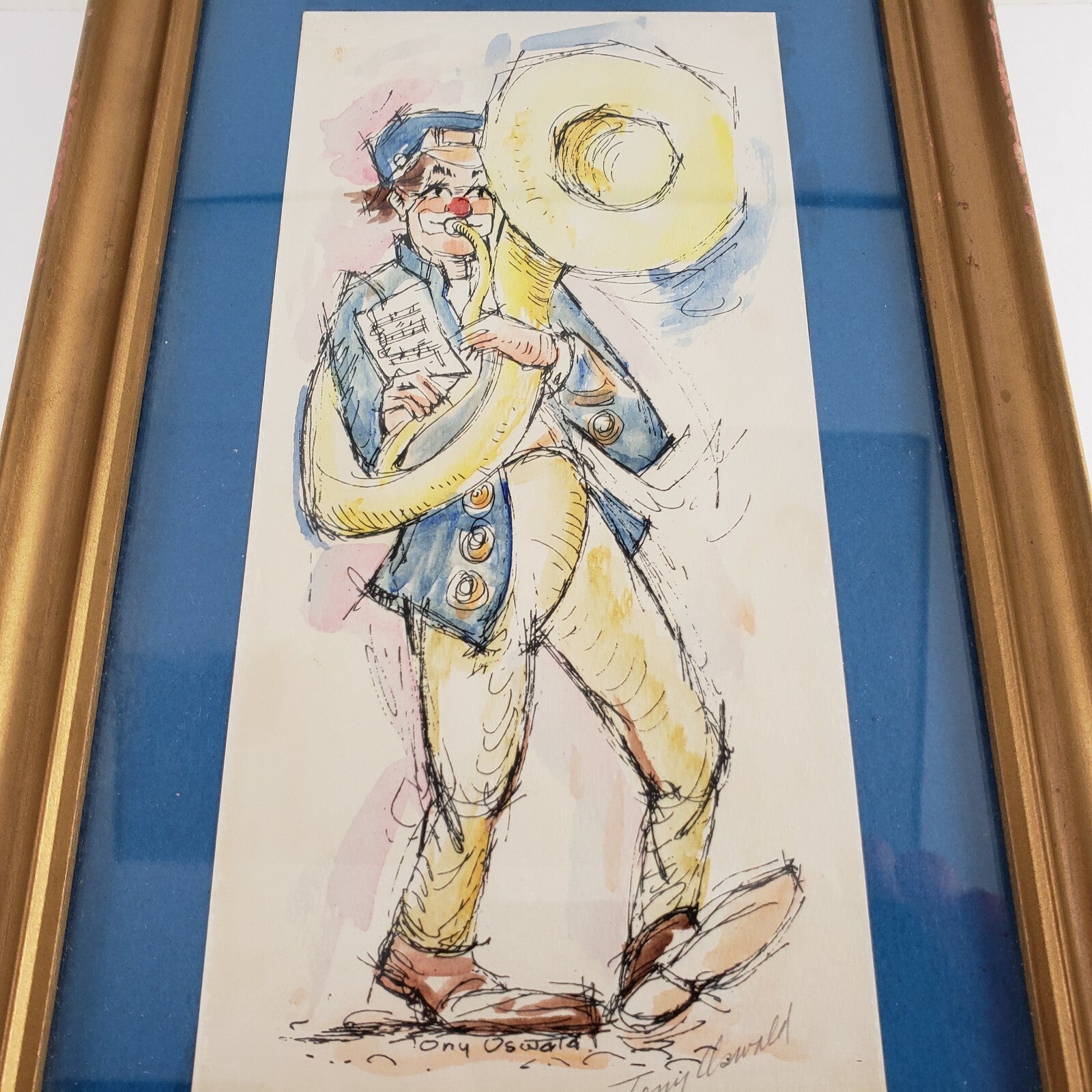 Vintage watercolor sketch of a clown playing a large horn, signed in pencil by artist Tony Oswald. Rendered in soft blue tones, this charming piece comes matted, framed, and ready to display.