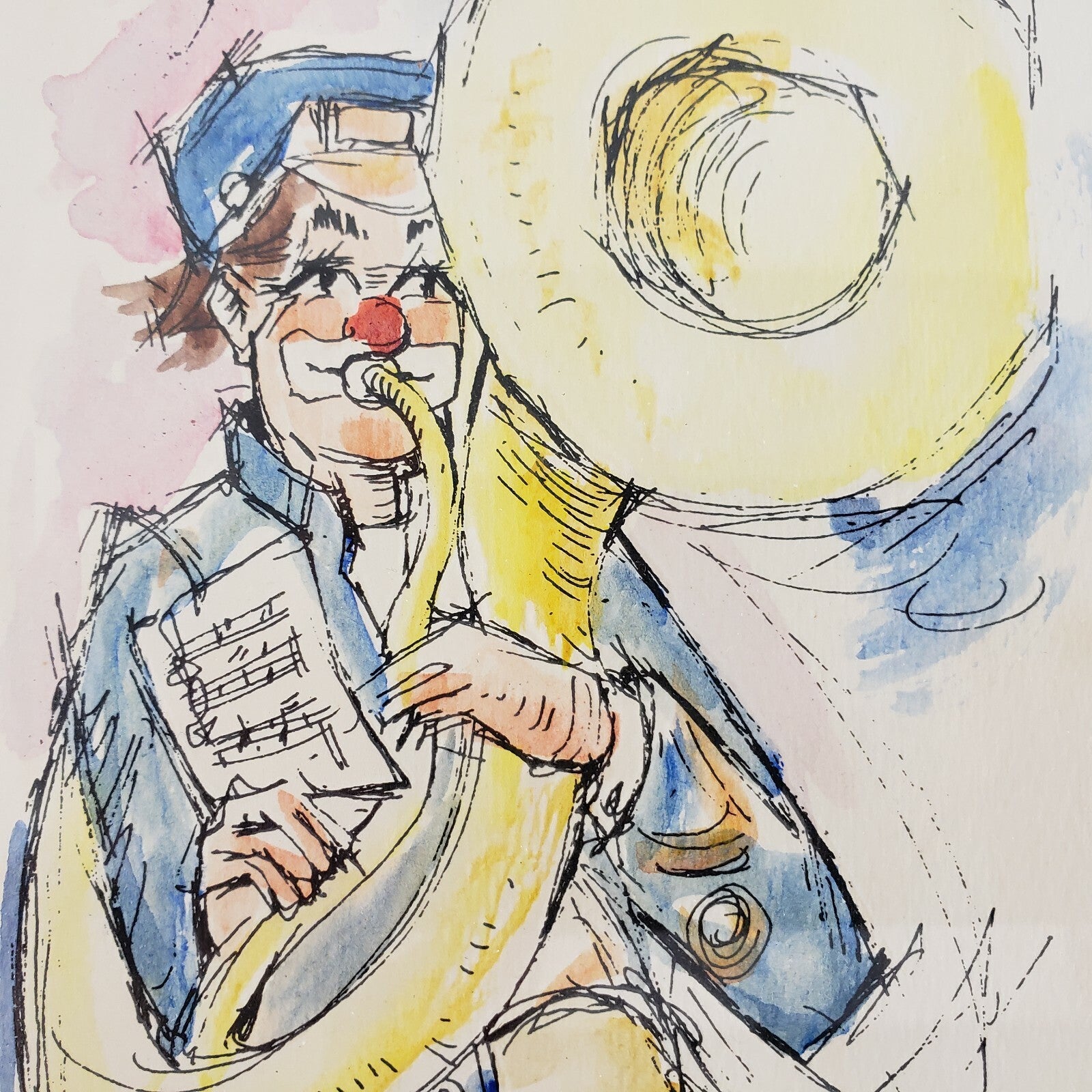 Framed Print Sketch of Clown Playing Big Horn Blue Watercolor Tony Oswald Signed