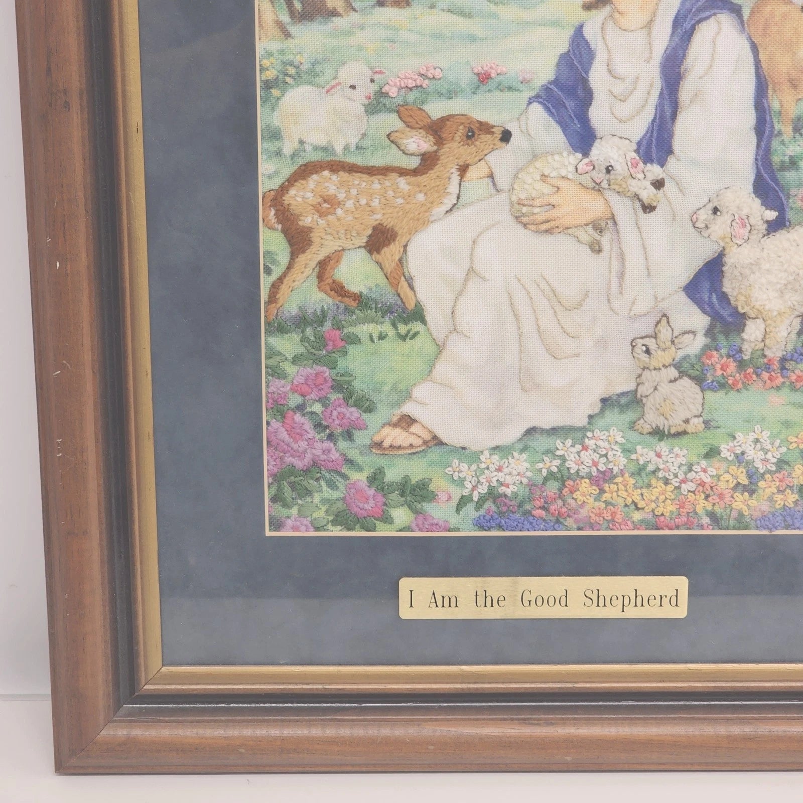 This framed crewel embroidery wall art depicts Jesus Christ seated in a serene garden setting, surrounded by lambs, a fawn, and a rabbit. A small plaque at the bottom center of the frame reads "Jesus the Good Shepherd." The design highlights themes of humility and Jesus' loving connection with all of God's creatures. Perfect for religious home decor or as a meaningful gift.