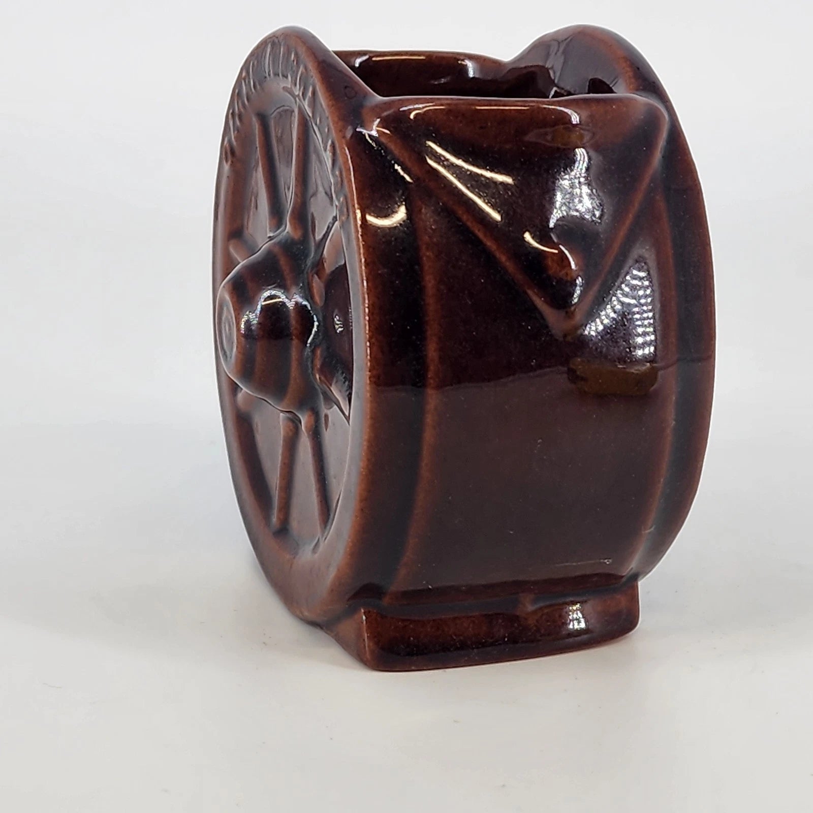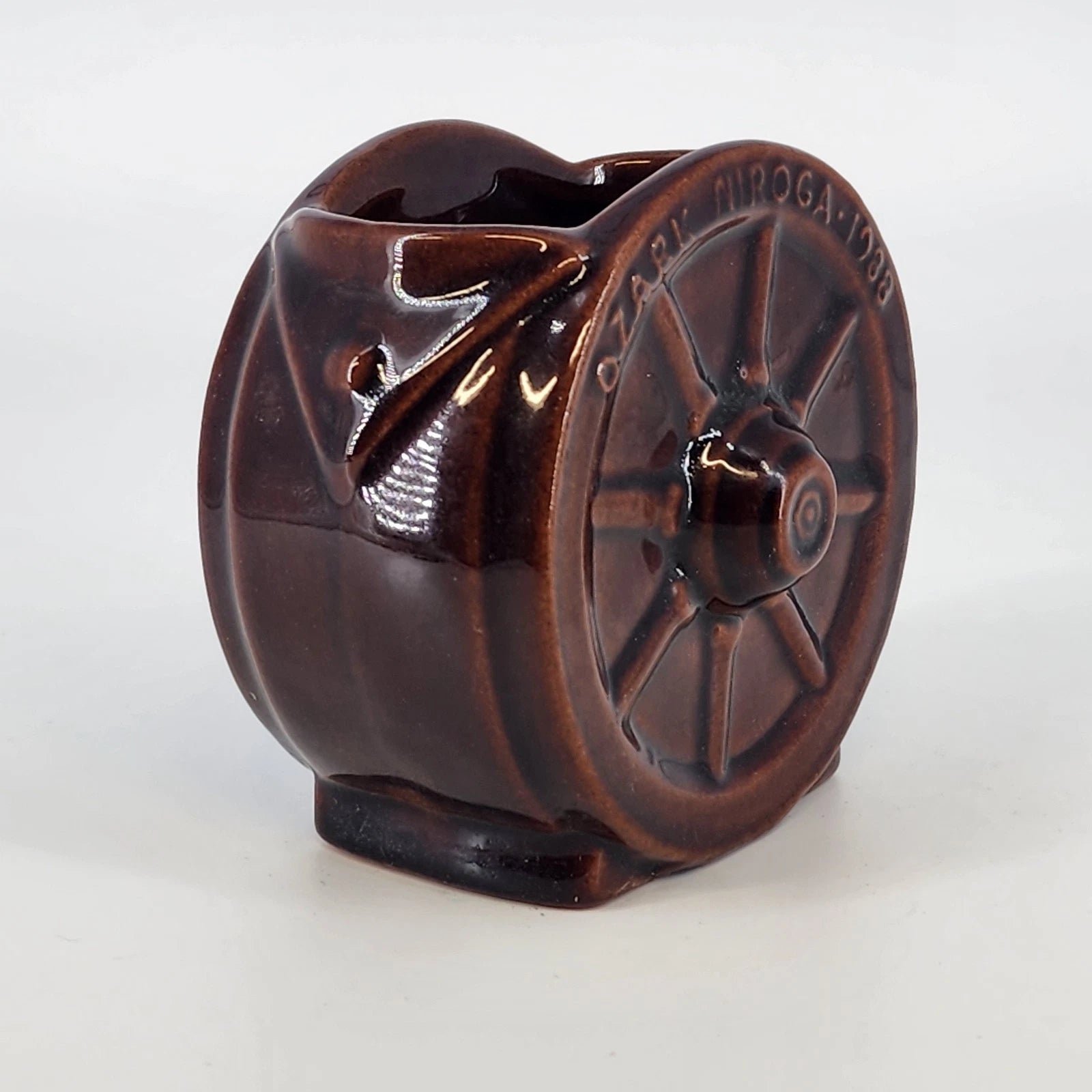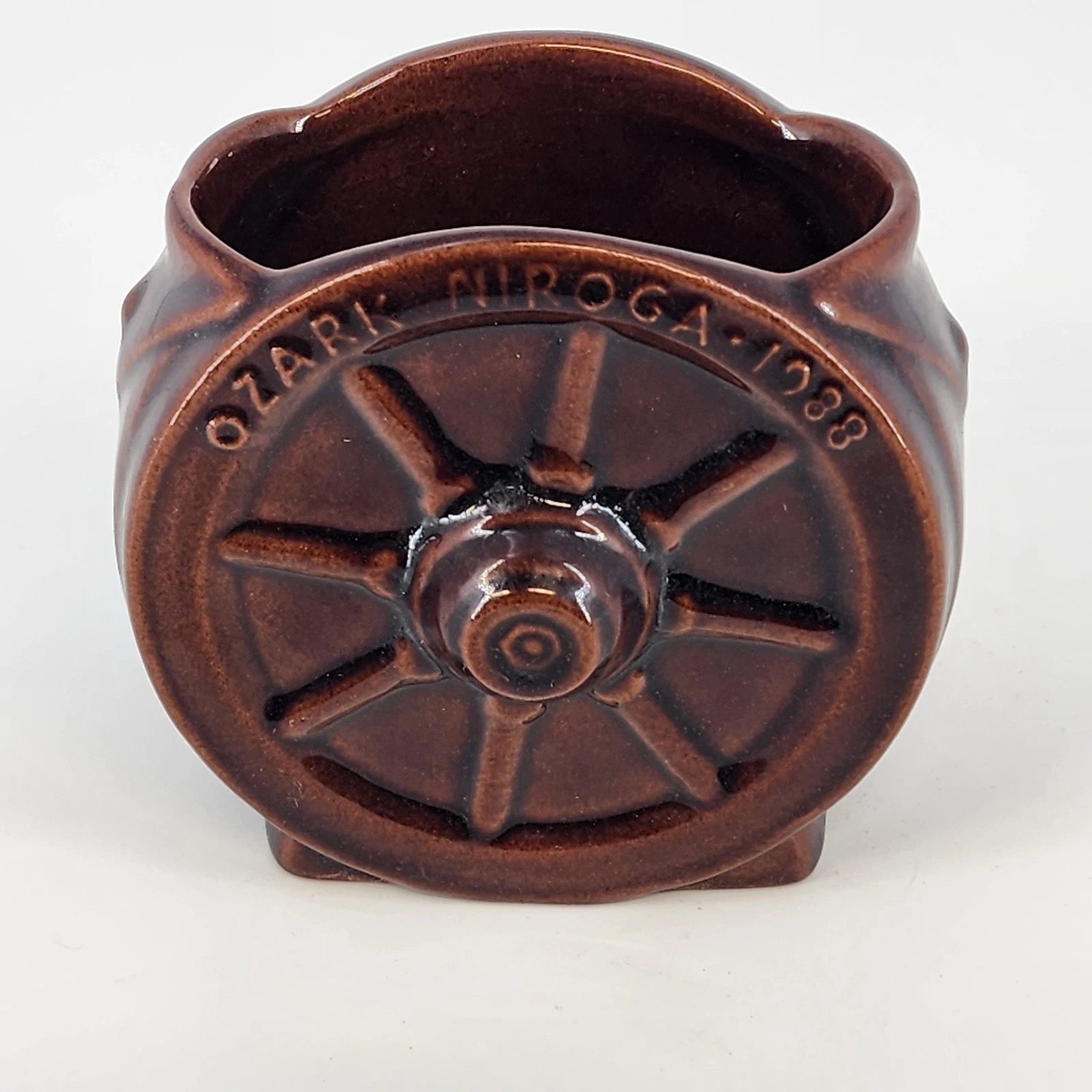 This unique piece of Frankoma Pottery combines a classic Southwestern design with a specific moment in local history. Featuring the iconic Wagon Wheel (94B) pattern in a rich earth-toned brown glaze, this open sugar bowl was produced as a commemorative item for "Remembering Ozark Niroga" in 1988. Crafted from Frankoma's signature Oklahoma clay, it features the rugged, tactile wheel motif on both sides. Whether you are a dedicated Frankoma collector or a fan of Ozark regional memorabilia, this dual-purpose collectible serves as both a functional kitchen piece and a charming historical artifact.