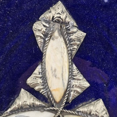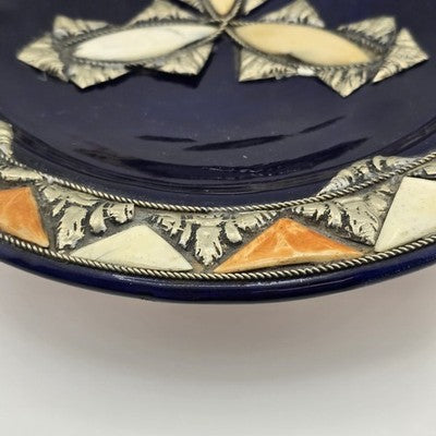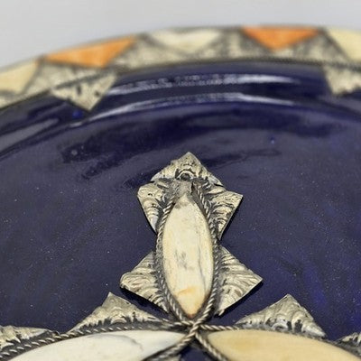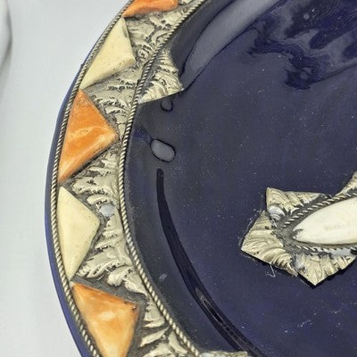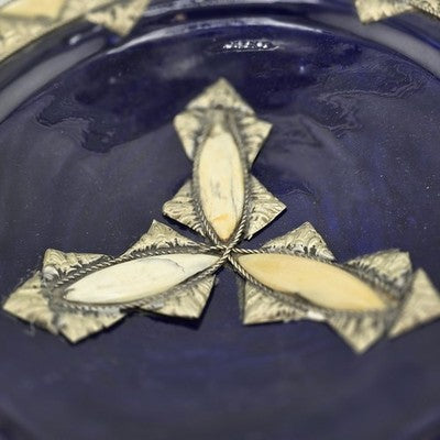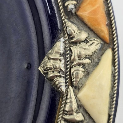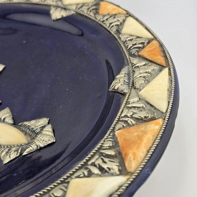 French Ceramic Centerpiece Bowl Cobalt Blue Glaze Silver Hand Carved Shell Inlay