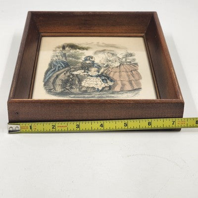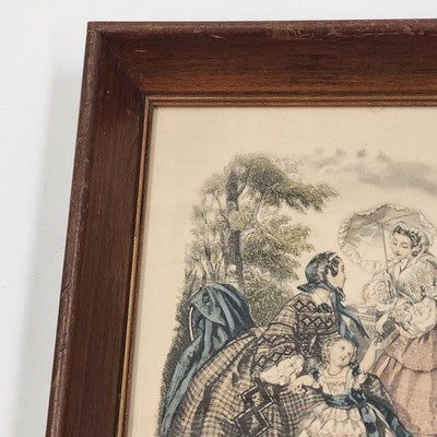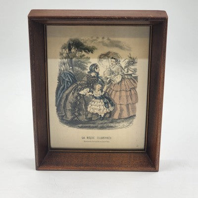 This vintage framed print from the 1940s features an illustration from "La Mode Illustrée," a renowned 19th-century French fashion magazine celebrated for its detailed depictions of Victorian-era attire. The artwork showcases elegantly dressed Victorian ladies, capturing the essence of 19th-century French fashion. The print is framed in a mahogany frame, enhancing its classic appeal.