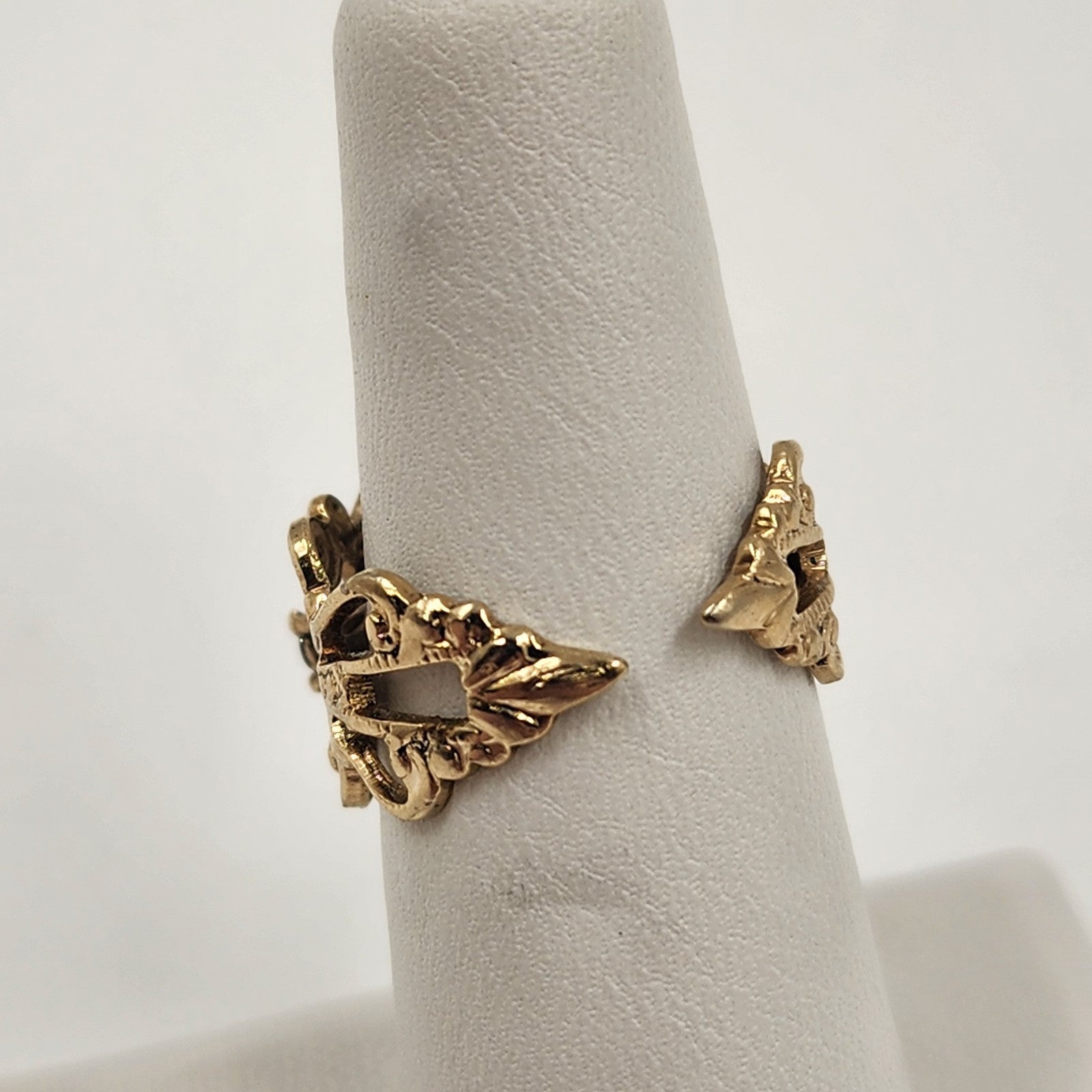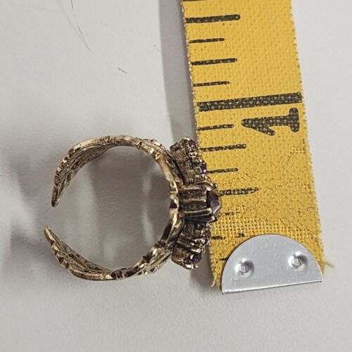 Gold tone filagree open shank band ring with garnet color rhinestone.