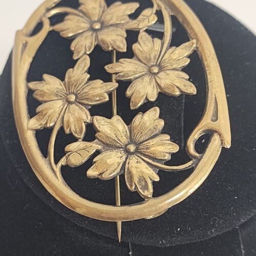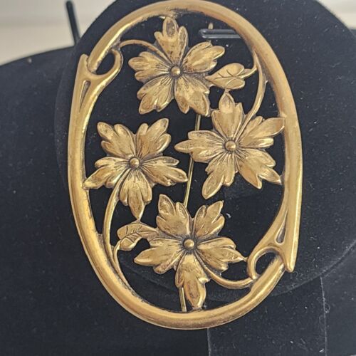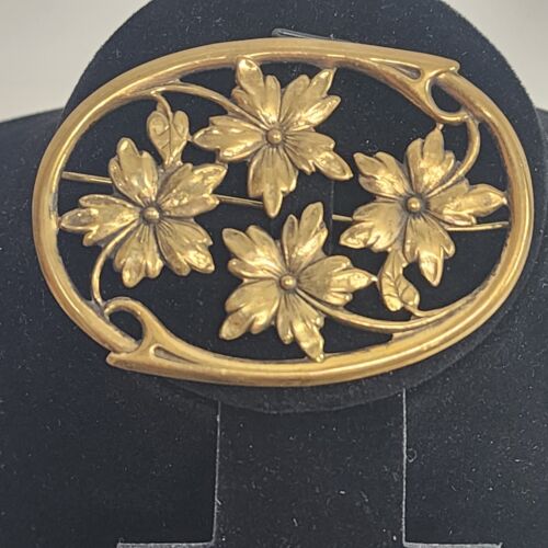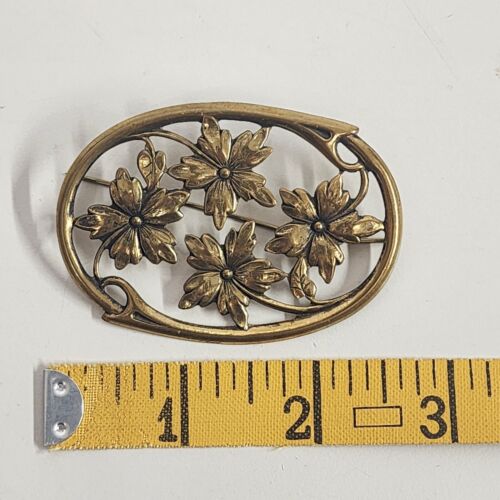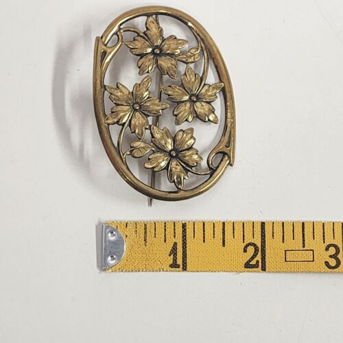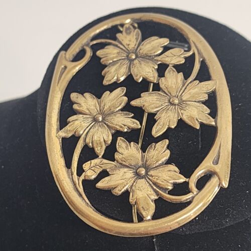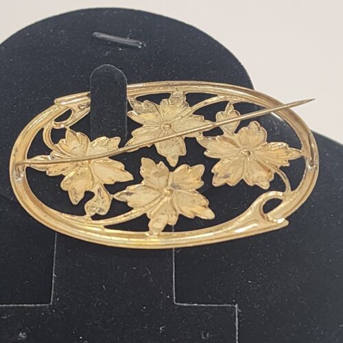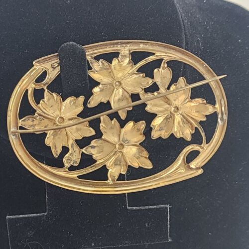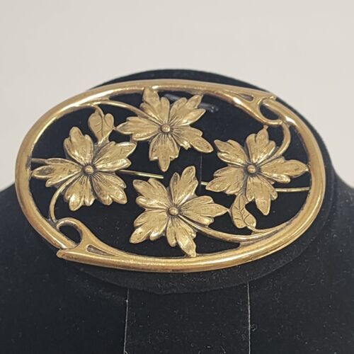 Gold Tone Floral Oval Brooch Flowers Vintage Costume Jewelry Ivy Leaf Danish