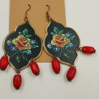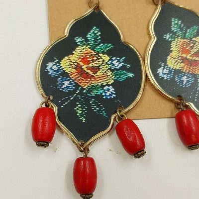 Beautiful multicolor floral dangle earrings with a black background, gold tone edging, and red drop beads for an elegant finishing touch. These statement earrings feature a hook closure and measure approximately 3" x 1.5", making them the perfect accessory for a bold, vintage-inspired look.
