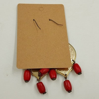 Gold Tone with Floral Tapestry Look on Black w Red Drop Beads Earrings Jewelry