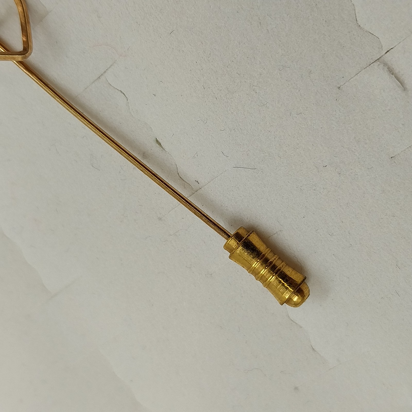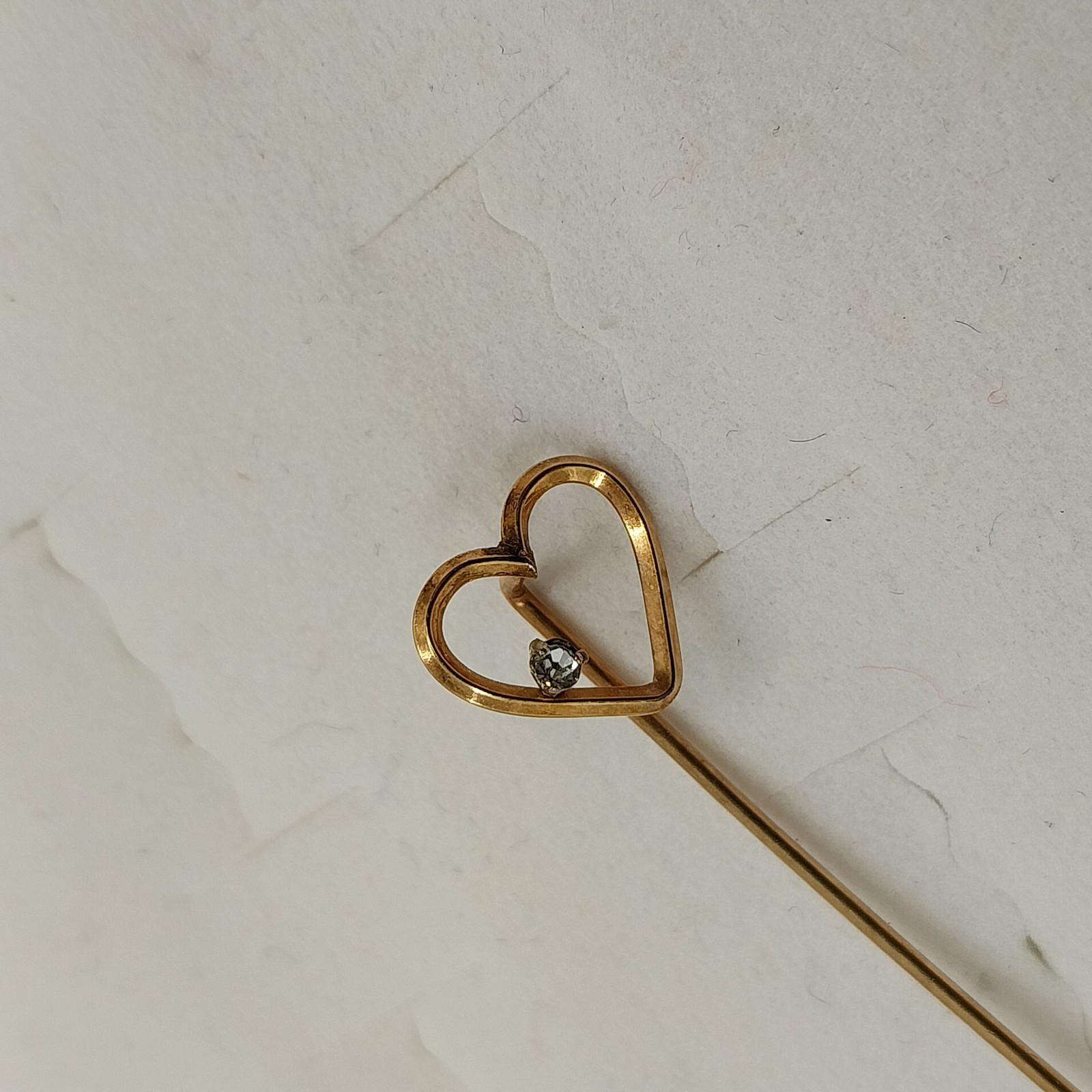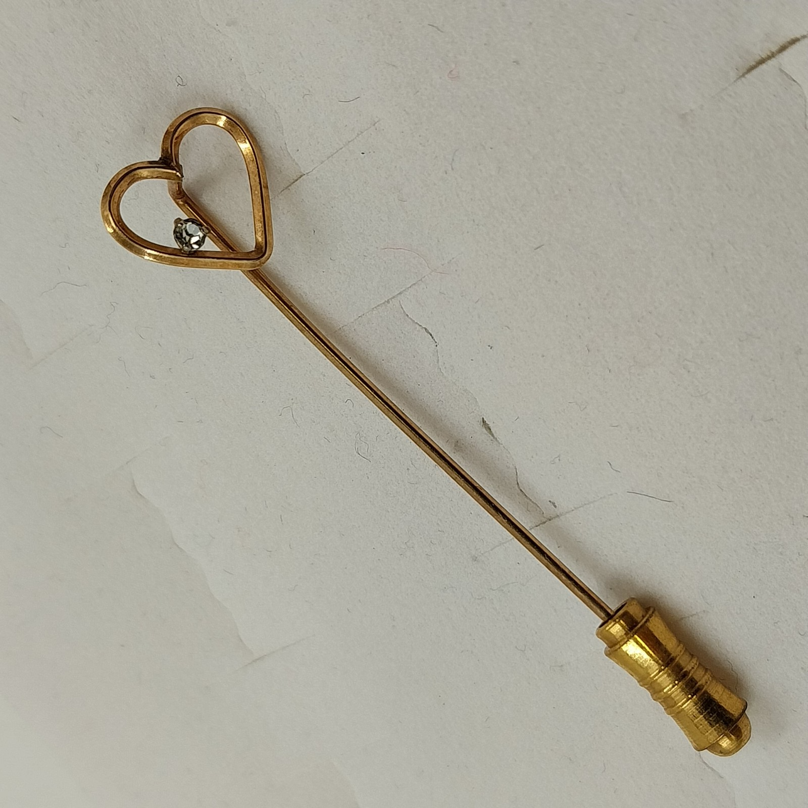 This vintage gold-tone stick pin features a delicate heart-shaped design accented with a clear faceted rhinestone, adding subtle sparkle and elegance. Secured with a classic trombone clasp, it's perfect for lapels, hats, or as a timeless gift.