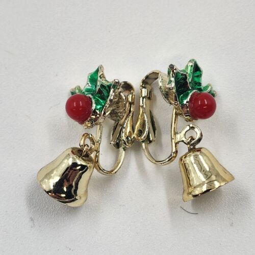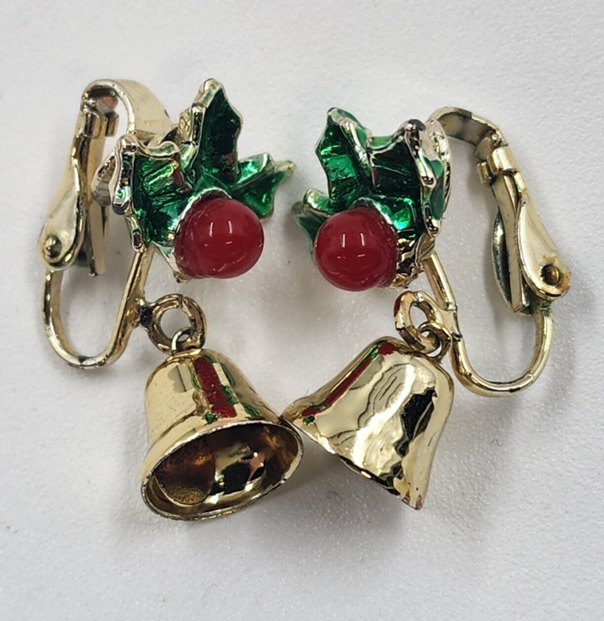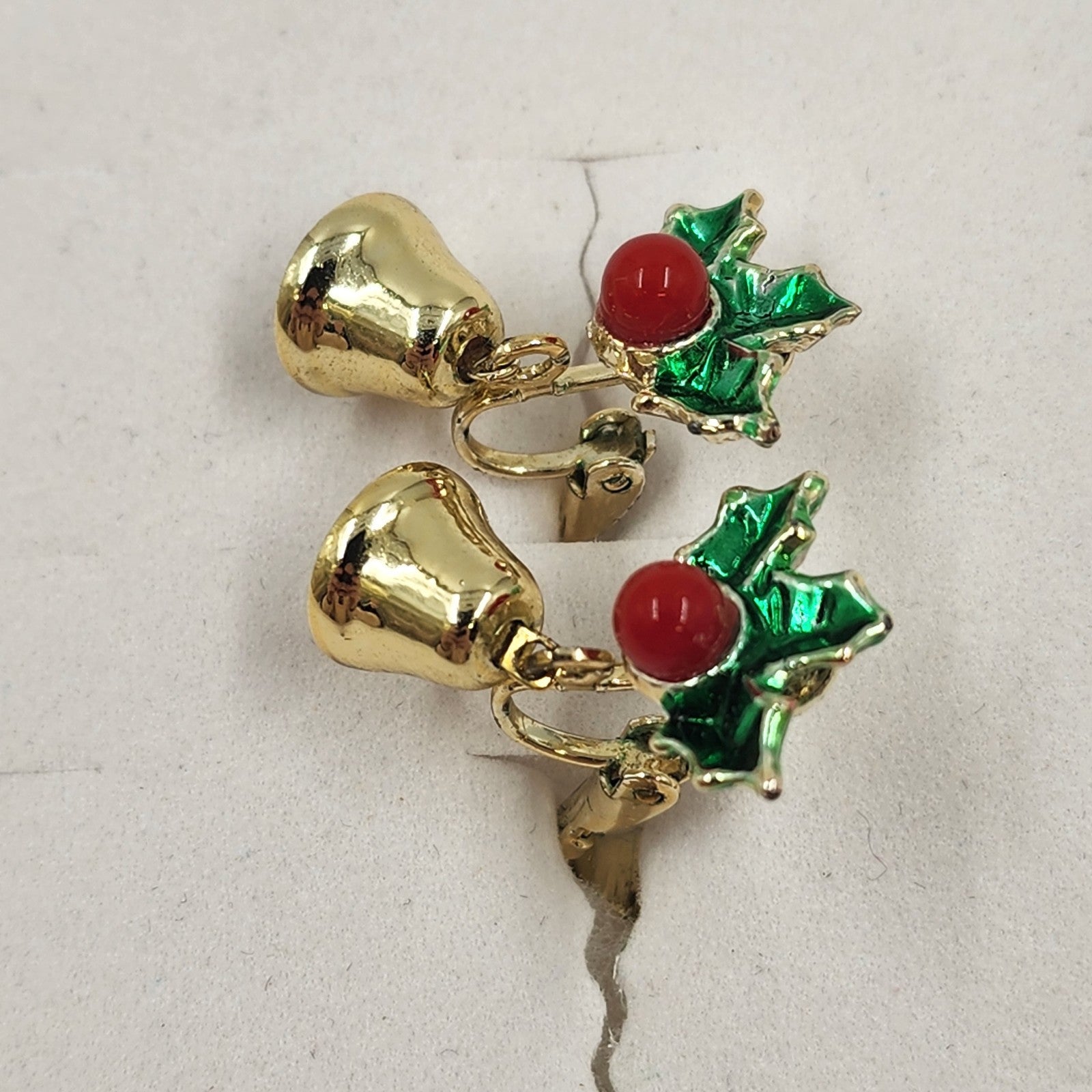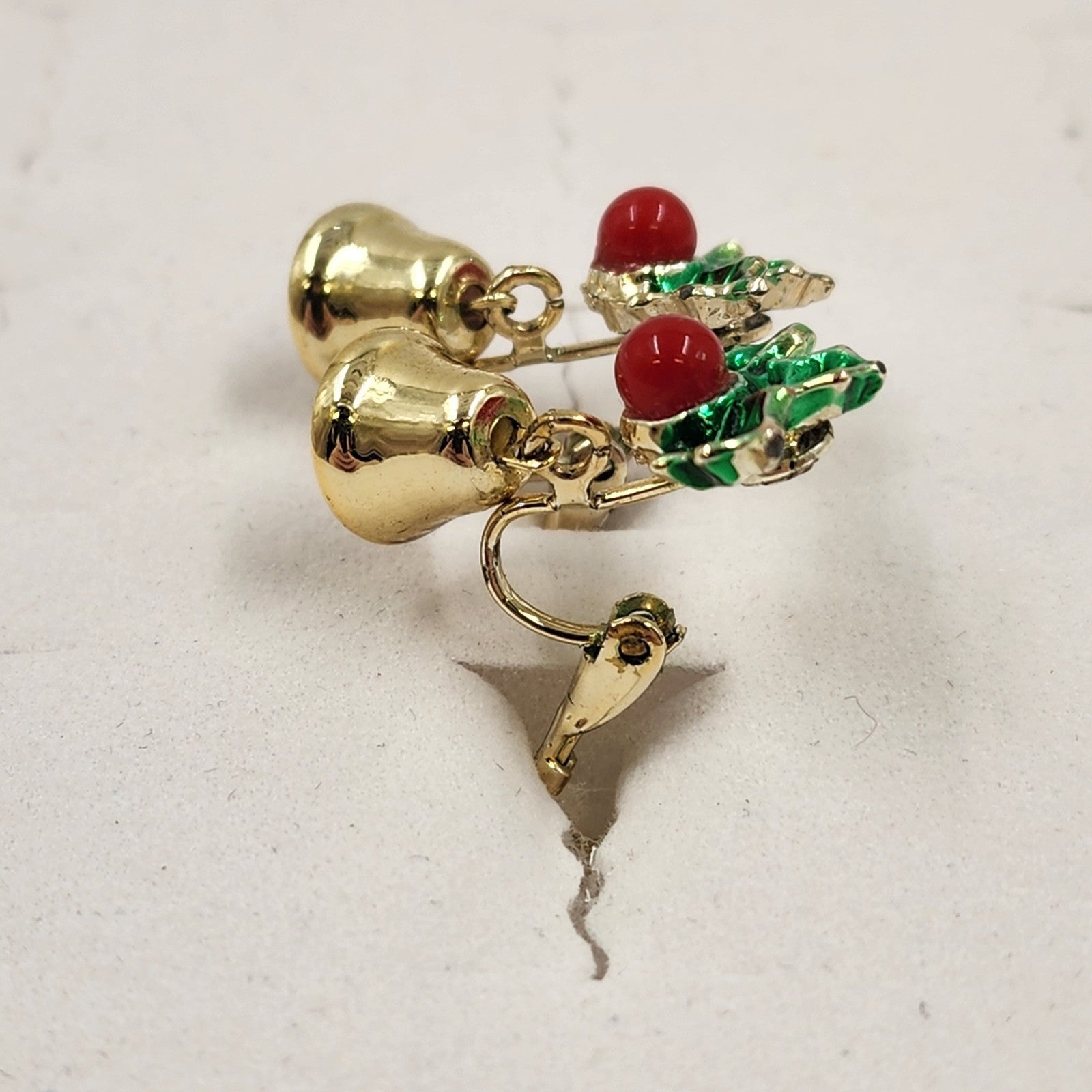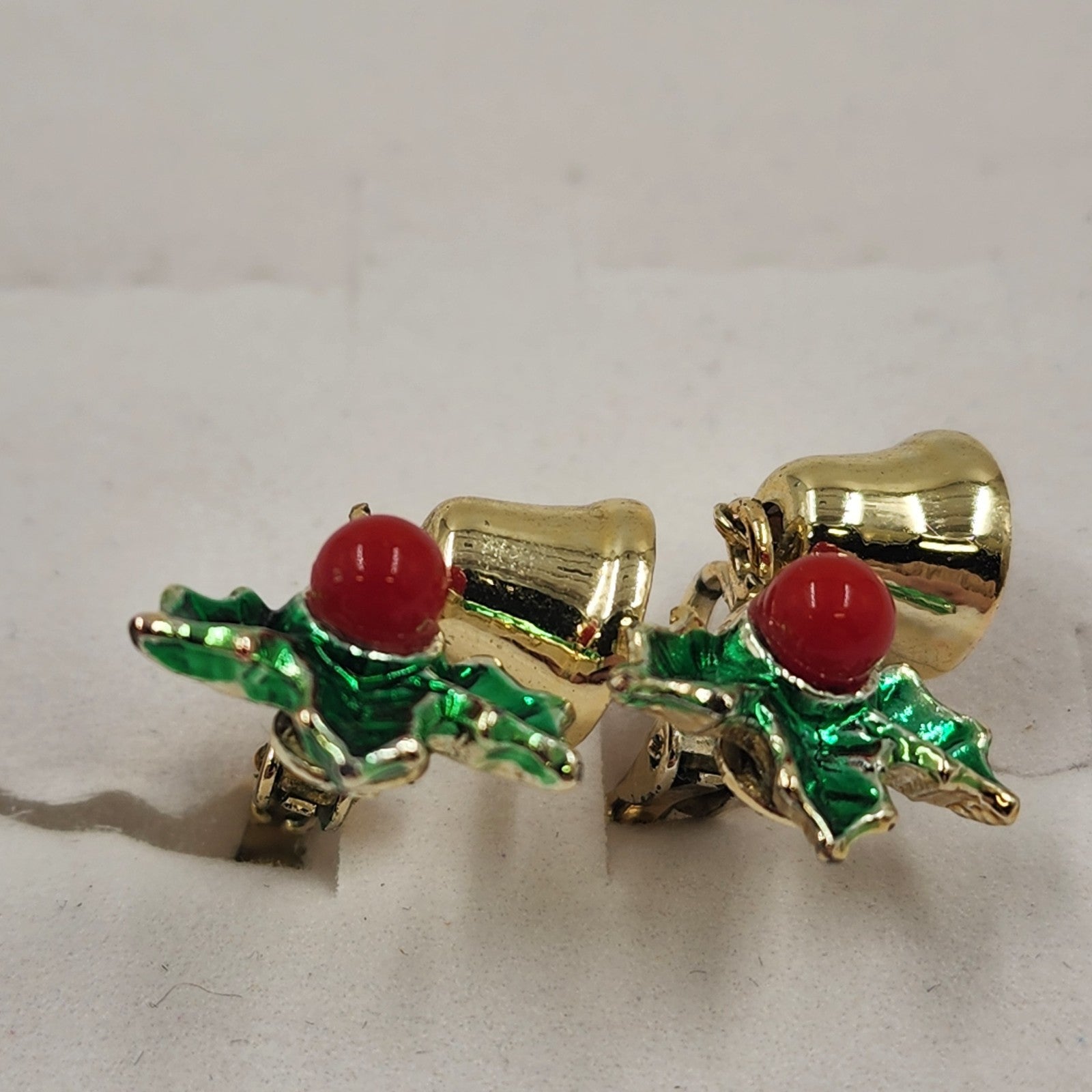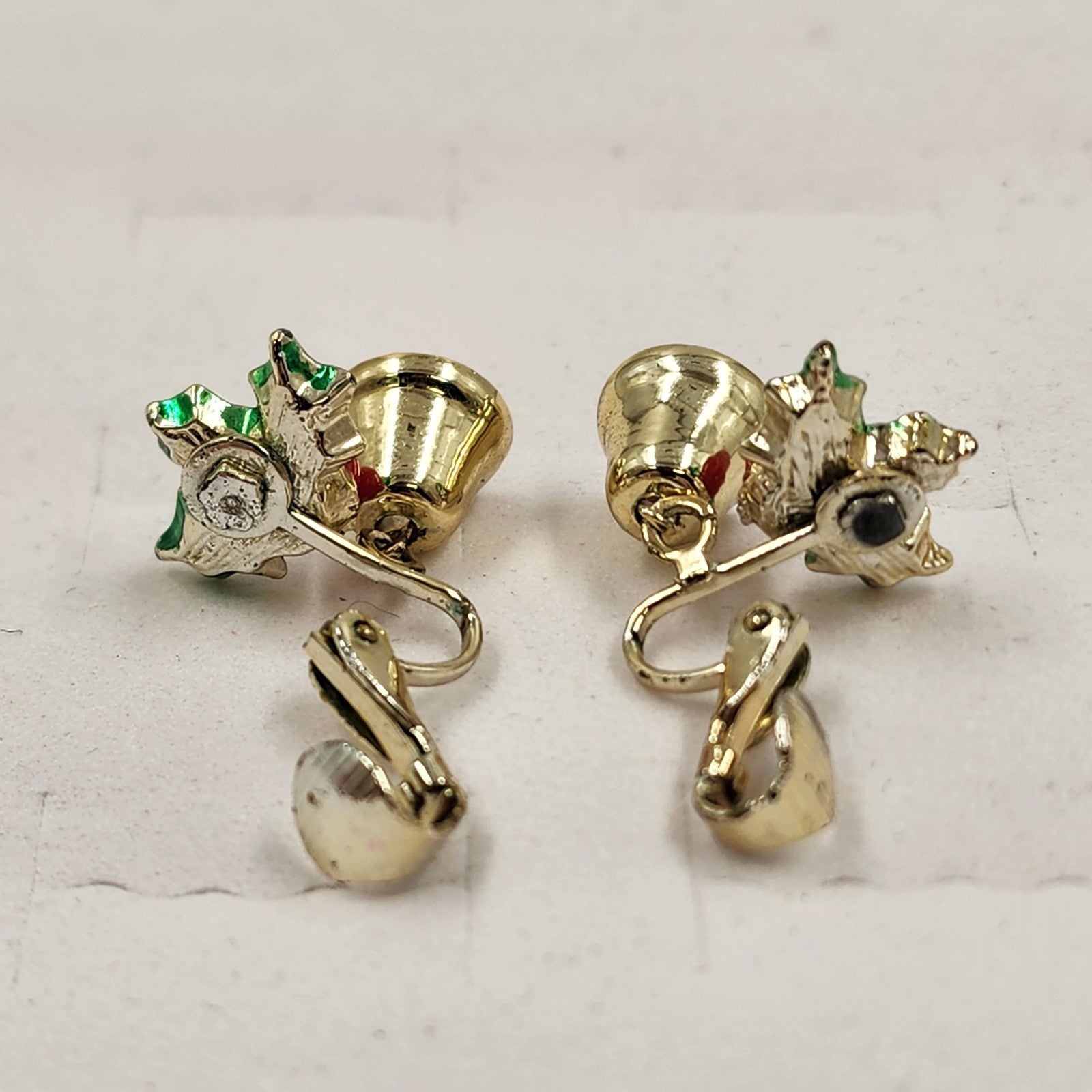 Gold Tone Holly & Bell Clip Earrings Vintage Christmas Fashion Jewelry 0.75"