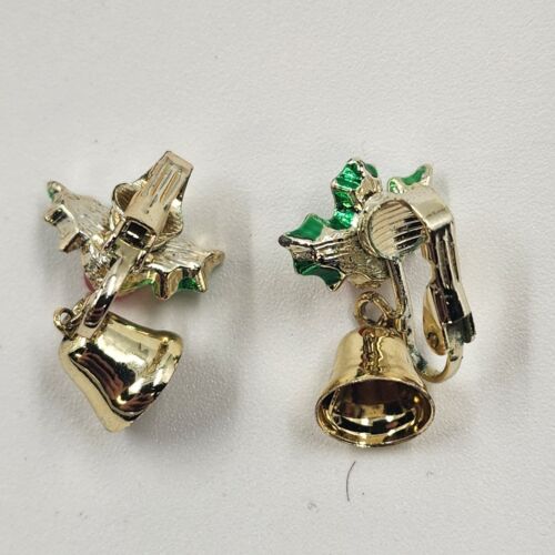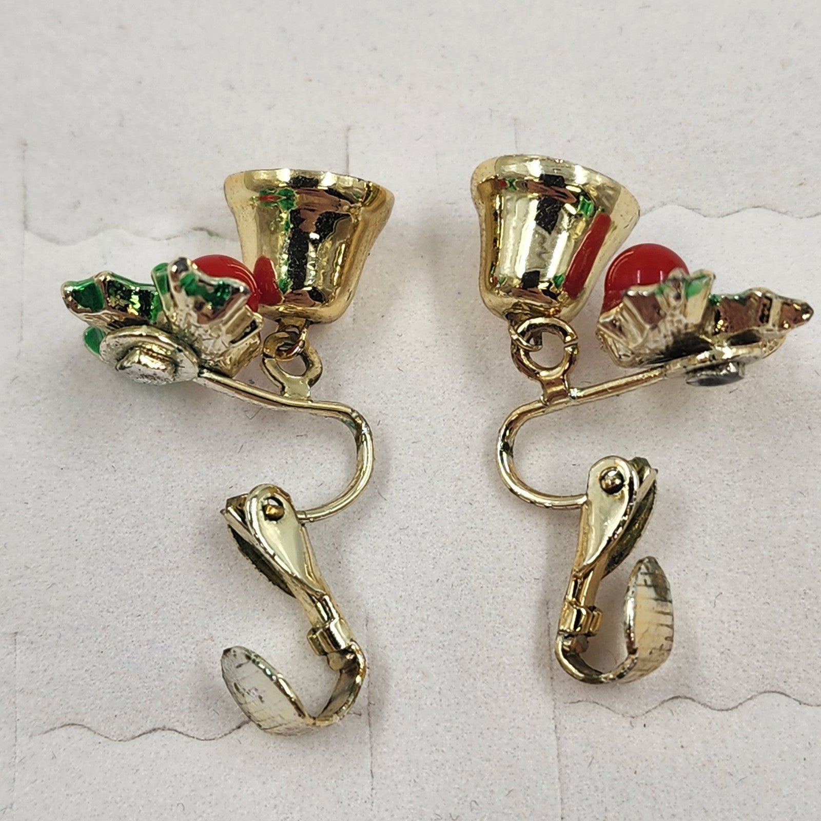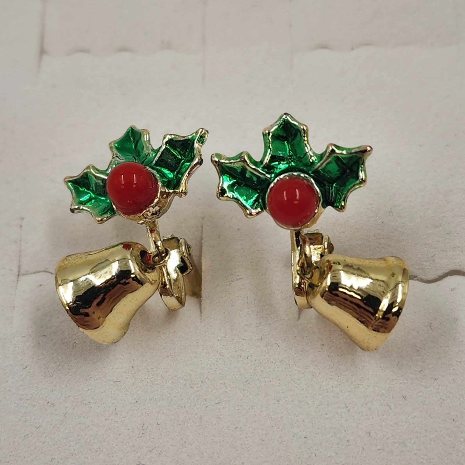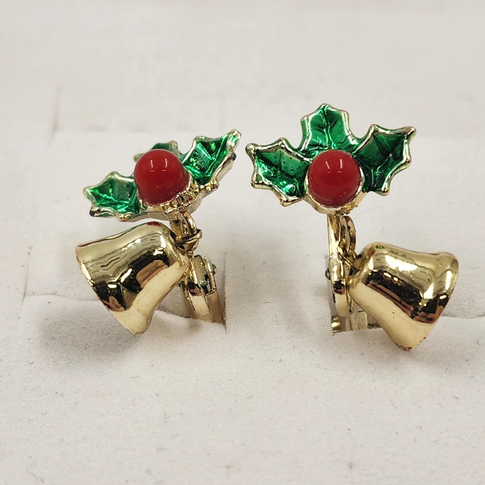 These vintage Gold Tone Holly and Bell Christmas Clip-On Earrings feature a leaf/bell shape with a dangle/drop style. The earrings are adorned with red accents, adding a festive touch for the Christmas occasion. The clip-on closure makes them easy to wear on the lobe. Perfect for adding a touch of holiday cheer to your ensemble.