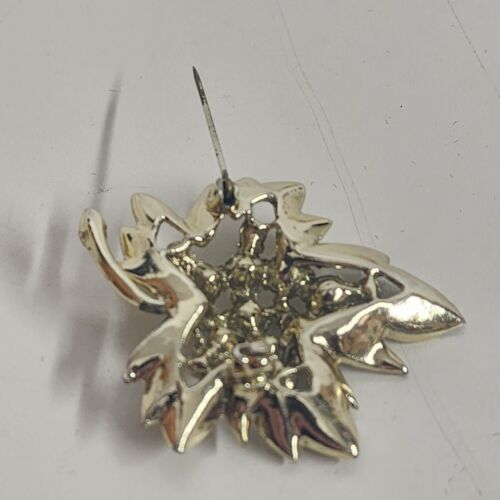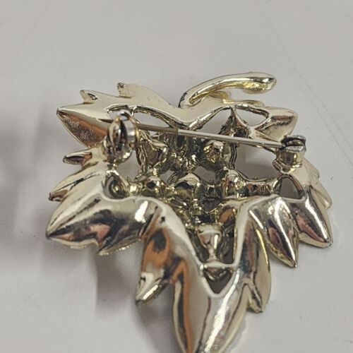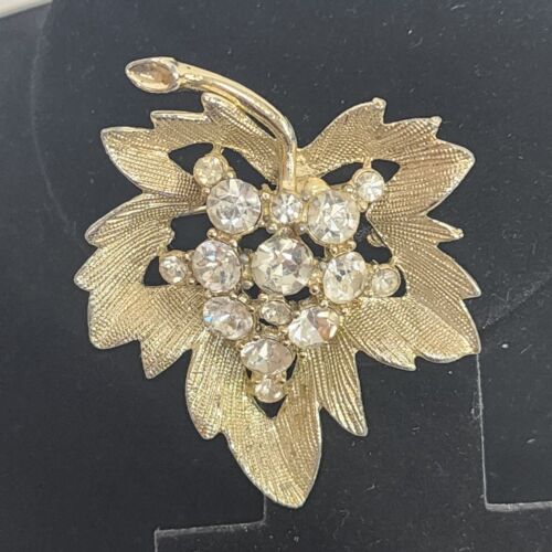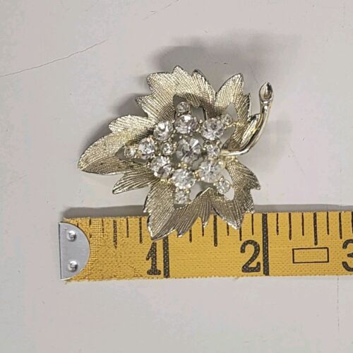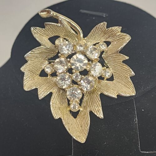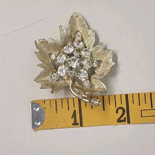 Gold Tone Leaf Brooch with Clear Rhinestones Brushed Finish 1.5" x 2" Vintage