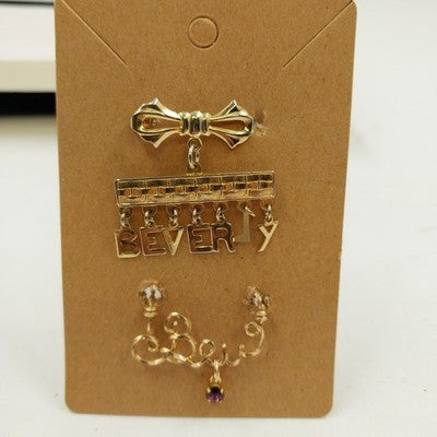 Set includes a vintage gold tone brooch with bow, rectangular bar, and dangling letters spelling "Beverly," plus a gold tone pendant reading "Bev" with a center purple rhinestone drop.