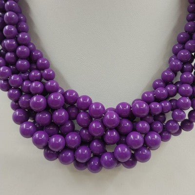 Add a vibrant statement to your jewelry collection with this twisted purple beaded necklace. Featuring six strands of glossy purple round beads, braided together for a bold, textured look. Finished with a secure lobster clasp and gold tone accents, this piece is perfect for both casual and dressy styles.