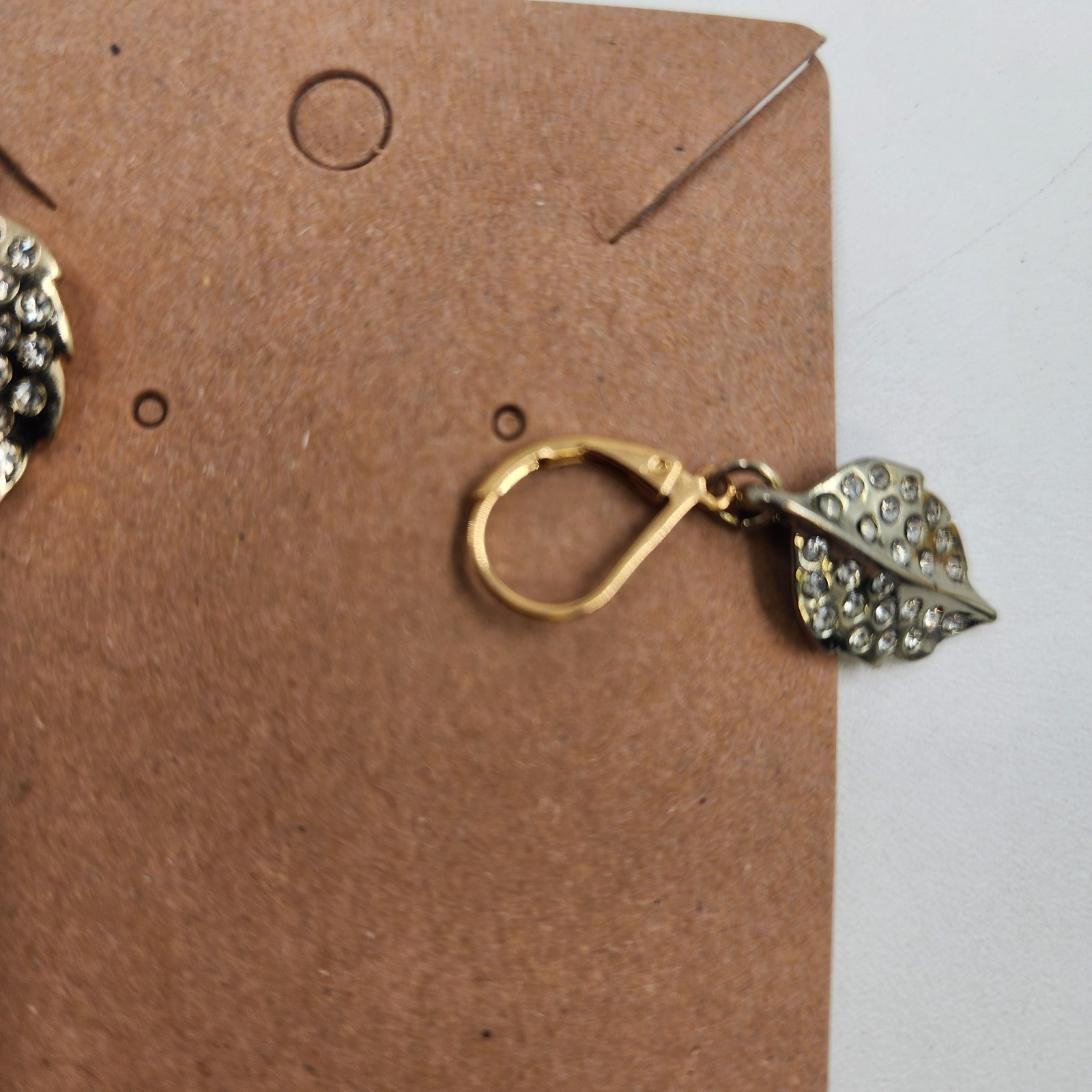 Gold Tone with Rhinestones Clear Crystal Leaf Shaped Drop Dangle Earrings 1.25"