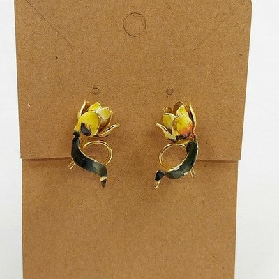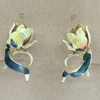 Delightfully vintage, these gold tone tulip flower earrings feature a charming multicolor design and a classic clip-on closure. Petite yet eye-catching, they bring a touch of retro floral flair to any look.