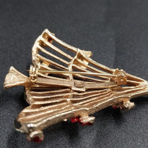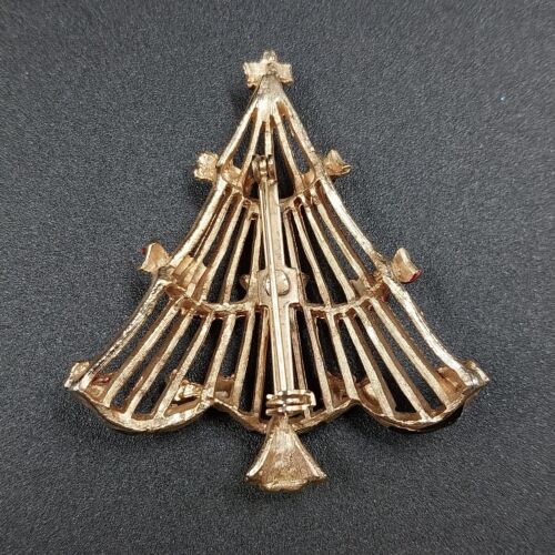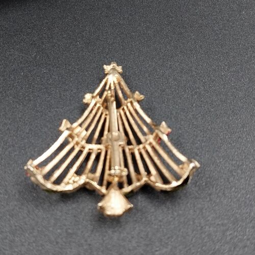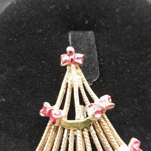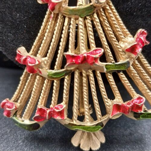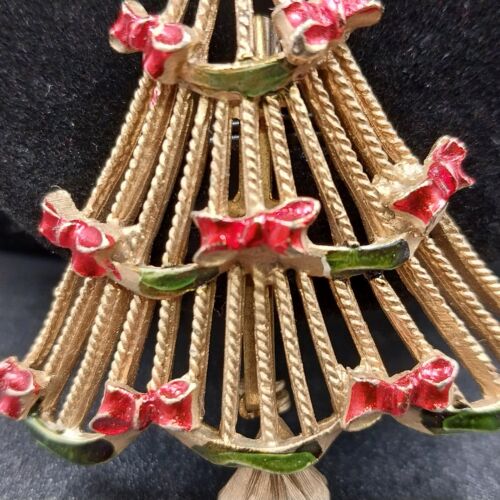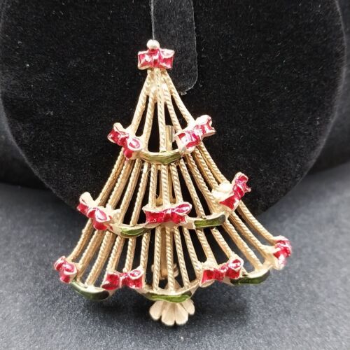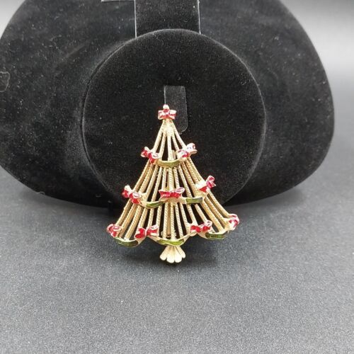 Celebrate the holiday season in style with this vintage goldtone Christmas tree brooch. Featuring intricate openwork design, red enameled ribbons, and green enameled garland, this festive pin adds a touch of charm to any outfit or collection.