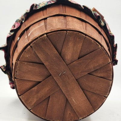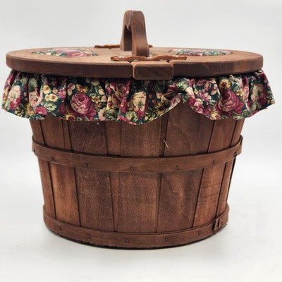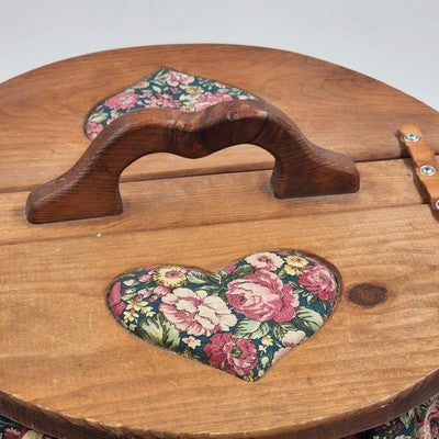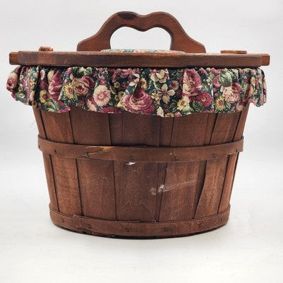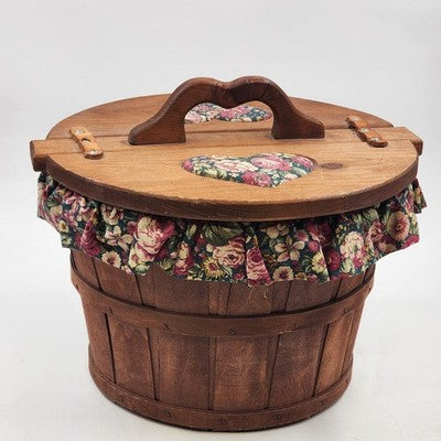 Half Bushel Wooden Sewing Basket Split Lid Heart Handle 15"x13" Floral Lined