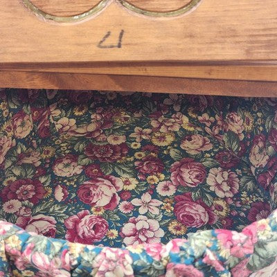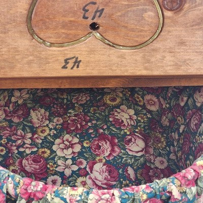 Add charm and functionality to your sewing room with this vintage half bushel sewing basket, beautifully crafted with a heart-shaped wooden handle and a classic split lid design. The interior is fully lined with floral fabric, making it both a practical and decorative storage solution.