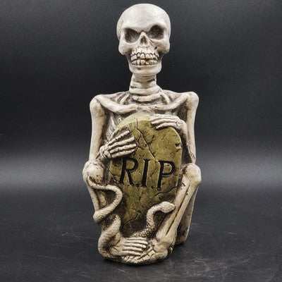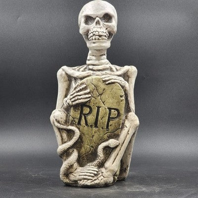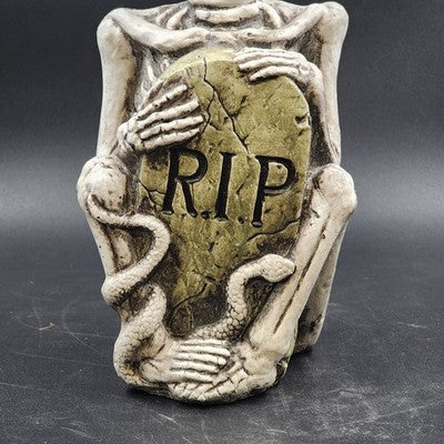 Creepy and fun Halloween resin molded gravestone featuring a skeleton, serpent, and bold R.I.P. design. Perfect as a yard decoration or for indoor haunted house displays.
