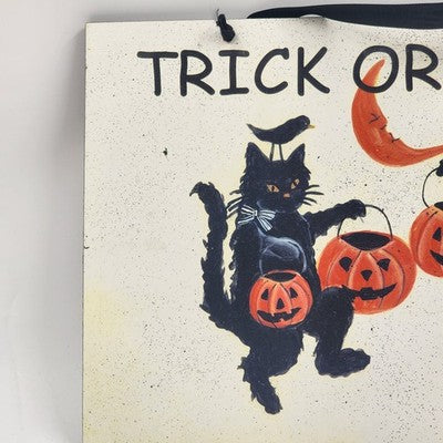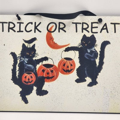 Celebrate the spooky season with this charming vintage Halloween sign featuring two black cats holding pumpkin buckets and the festive phrase "TRICK OR TREAT". This decorative piece captures the essence of Halloween fun and nostalgia, perfect for adding a playful and eerie touch to your home or party décor.
