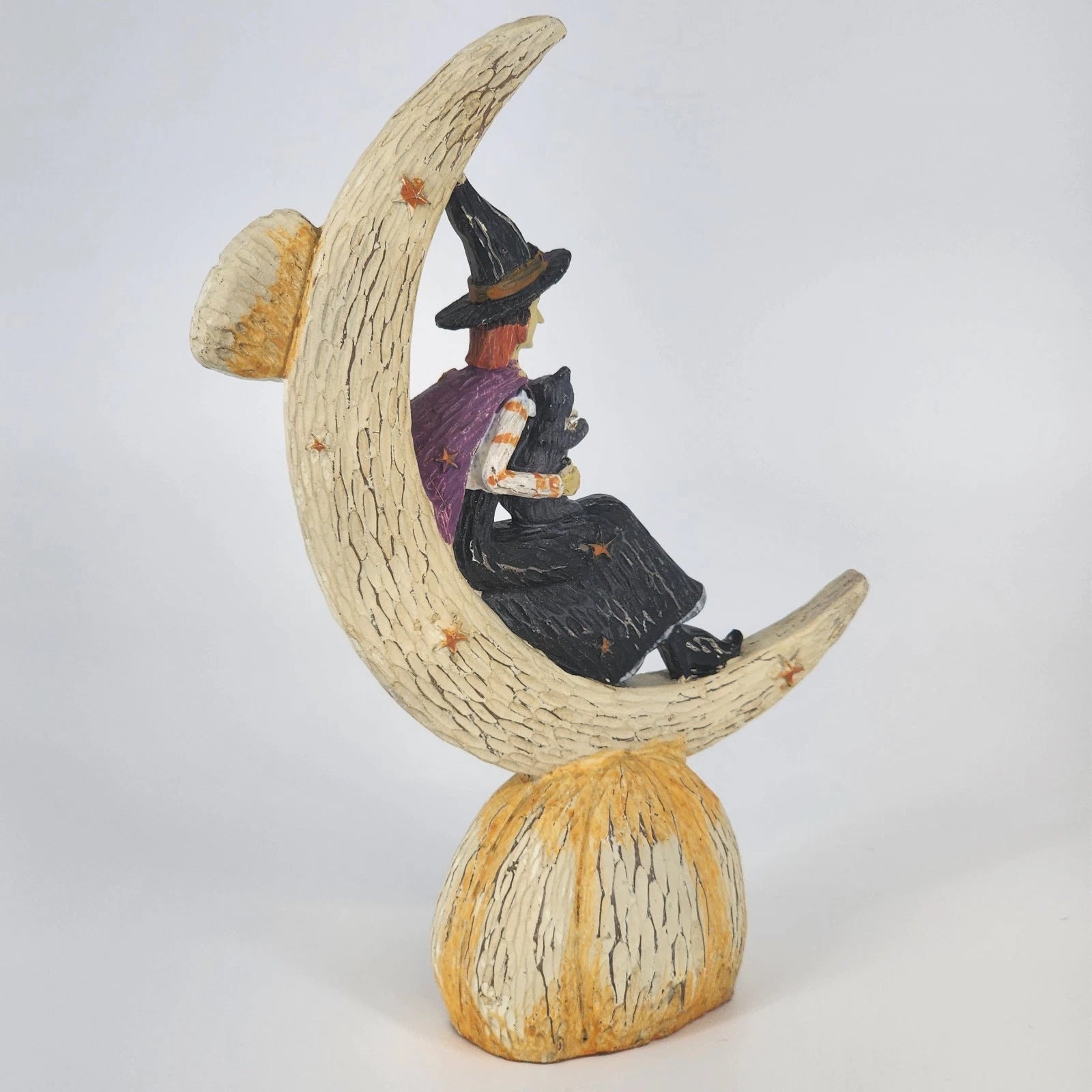 Capture the whimsical spirit of a classic All Hallows' Eve with this enchanting resin figurine. Featuring a charming witch perched atop a golden crescent moon, she is accompanied by her faithful black cat and trusty broomstick. The entire scene rests on a delightfully grinning jack-o'-lantern base. Hand-painted with a deliberate antiqued and distressed finish, this piece offers a nostalgic, folk-art aesthetic that looks like a treasured heirloom from decades past. It is the perfect centerpiece for a mantel, shelf, or spooky tabletop display.