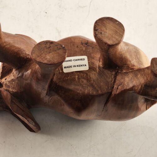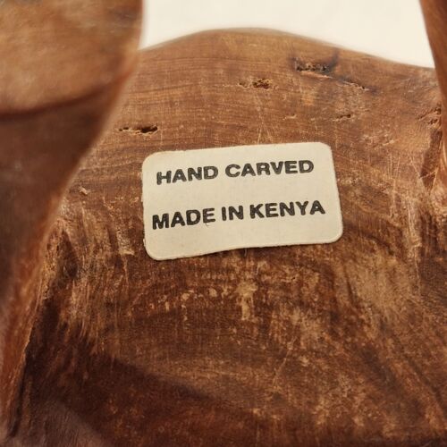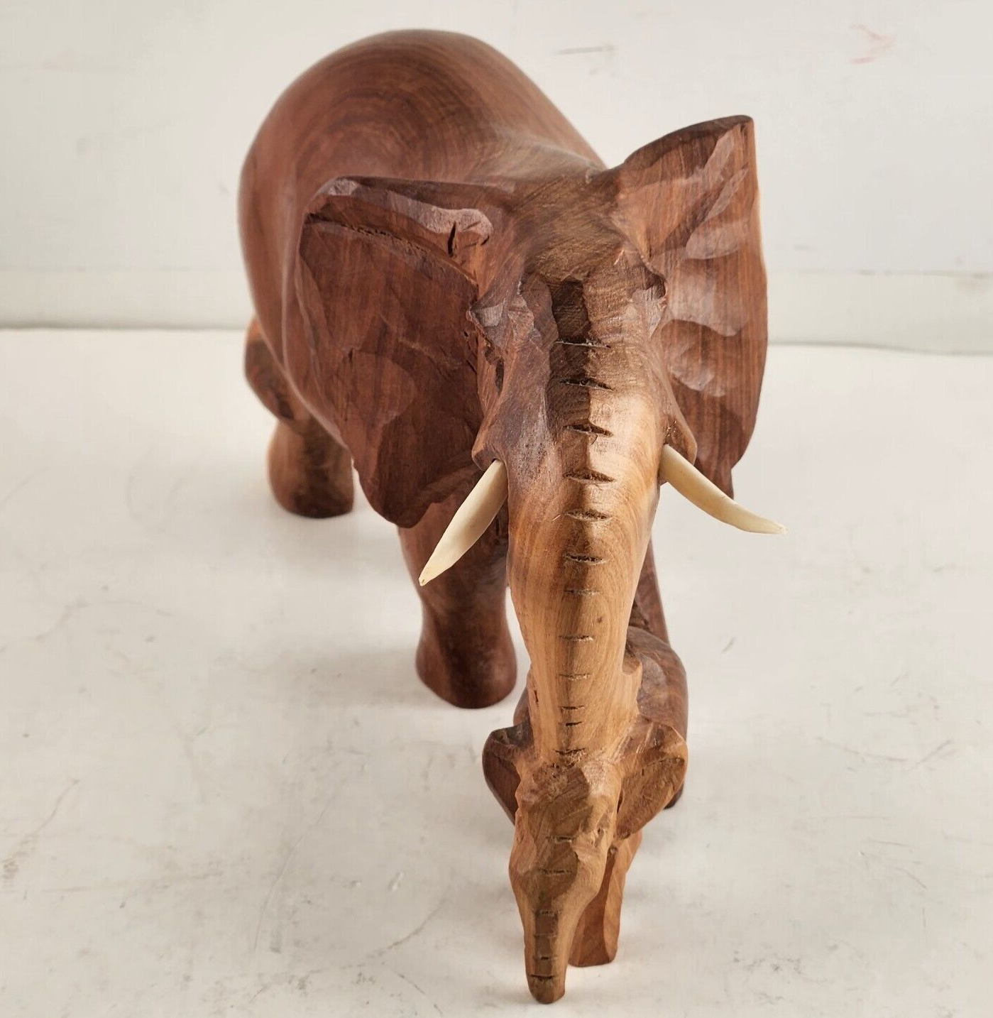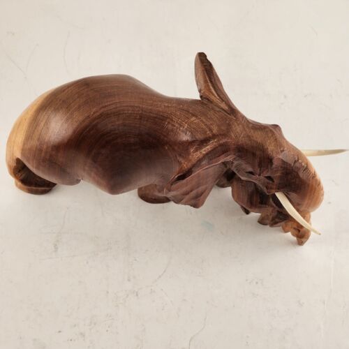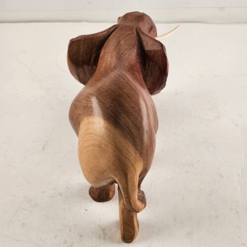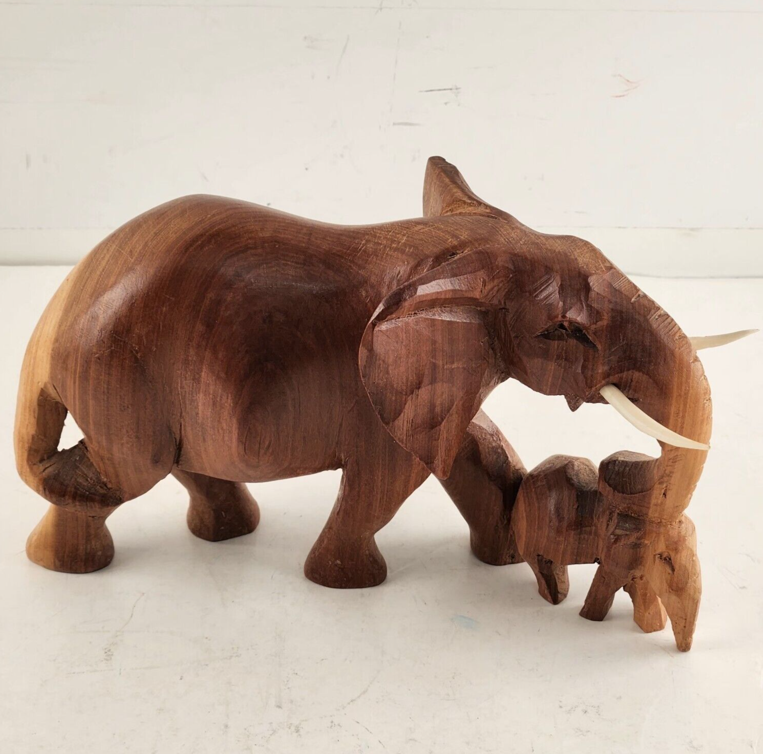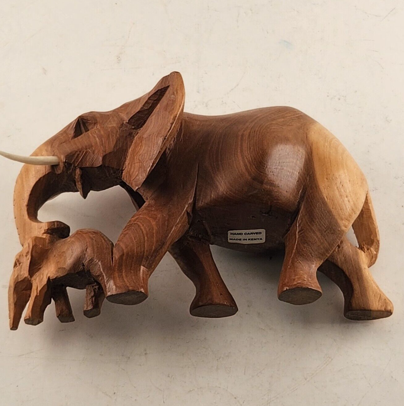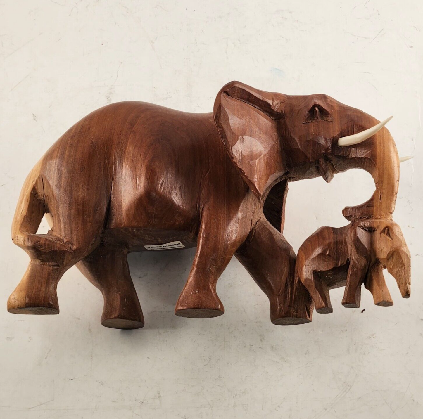 Hand Carved Wood Mother and Baby Elephant Figurine Removable Tusks Kenya 8" Long