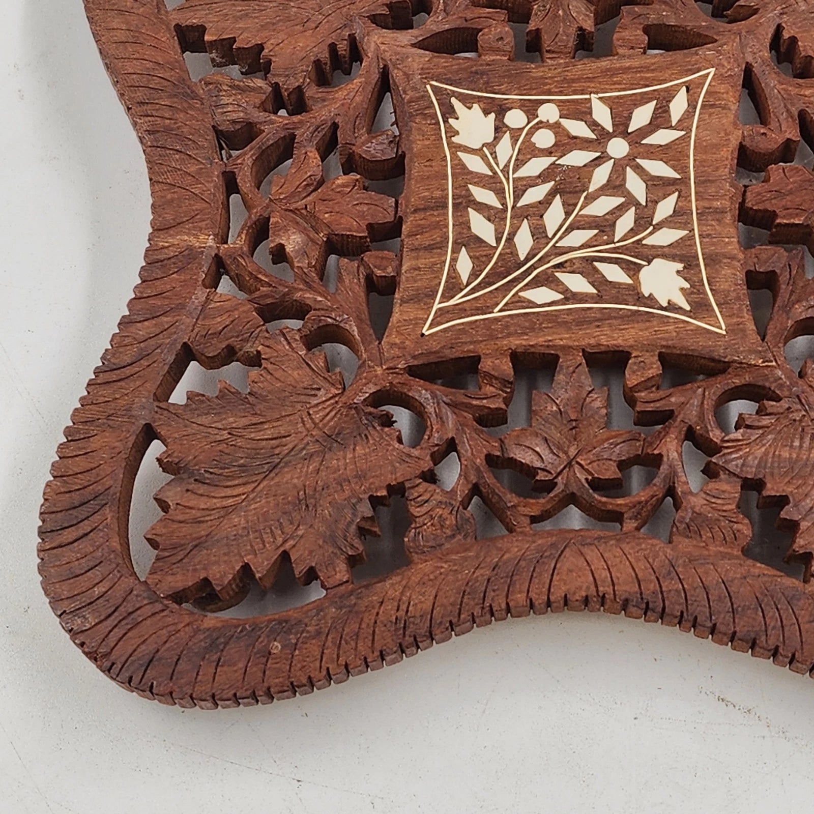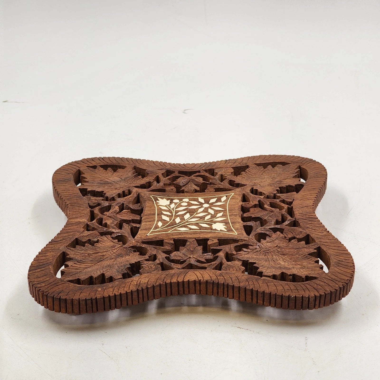 Hand Carved Wood Trivet 8" Square Gold Inlay Floral Design Vented Feet India Vtg