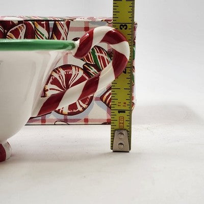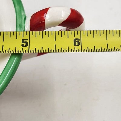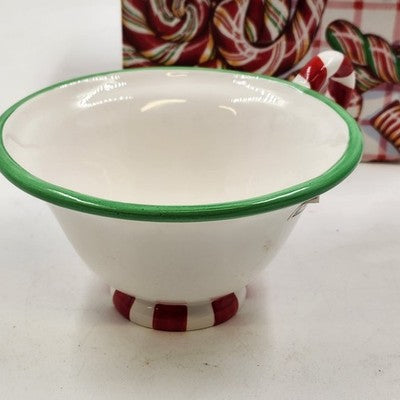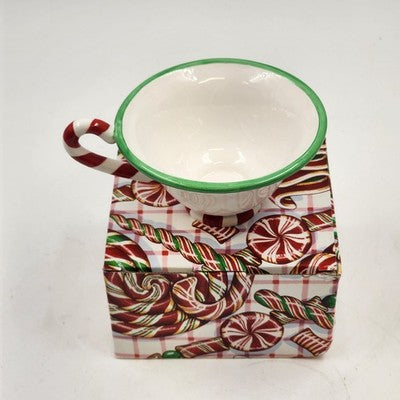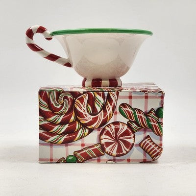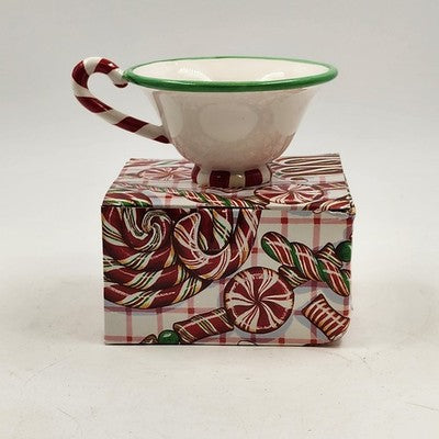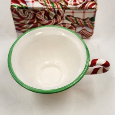 Charming Department 56 peppermint mug featuring a festive red and green hand-painted design. Perfect for holiday tea, coffee, or as a collectible gift item. Includes original box.