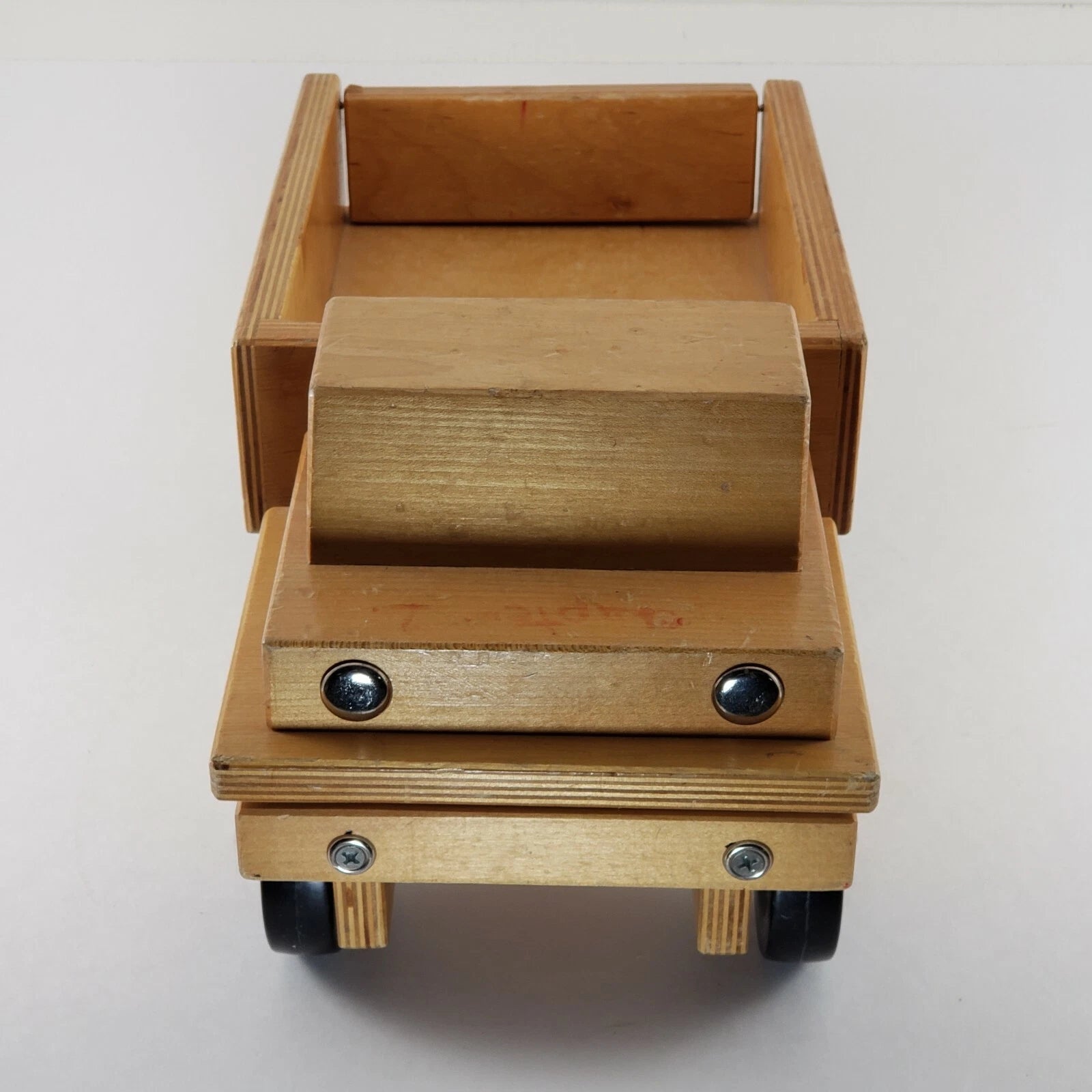 Charming vintage handmade wooden dump truck with a maple-tone finish. Features mixed solid wood and fine plywood construction, free-swinging tailgate, and sturdy 3" wheels. Shows light play wear, adding to its authentic vintage character. Ideal for display, collectible toy lovers, or rustic décor.
