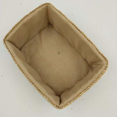 This rectangular storage basket is both functional and stylish, featuring a handwoven two-tone rattan design with a sewn liner for added practicality. Perfect for organizing small items while enhancing the aesthetic of your space. Its compact size makes it ideal for countertops, shelves, or tabletops.