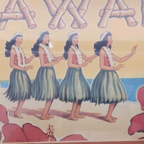 Add a touch of tropical paradise to your home decor with this stunning art print by Kerne Erickson. The piece features a vibrant portrayal of hula dancers in Hawaii. The print is produced using the high-quality Iris printing technique, ensuring its colors and details are true to life. The artwork is professionally framed in a faux bamboo frame, which adds a touch of Art Deco style to the piece. this large portrait orientation print is sure to make a statement on any wall. It's an original print and comes in a single piece, making it a unique addition to your art collection.