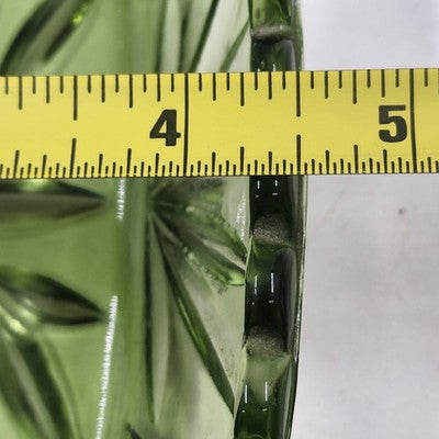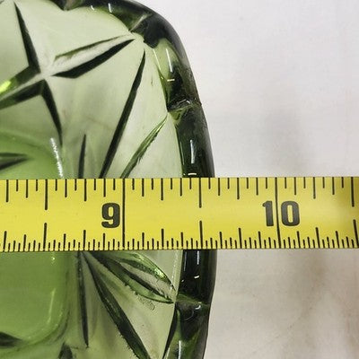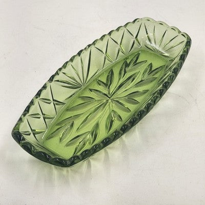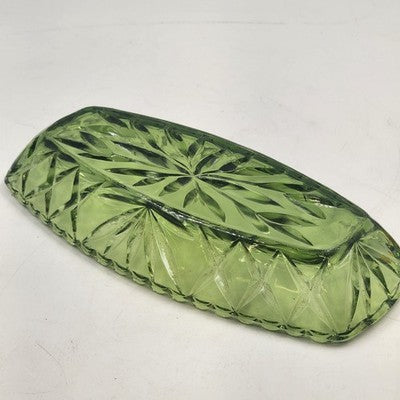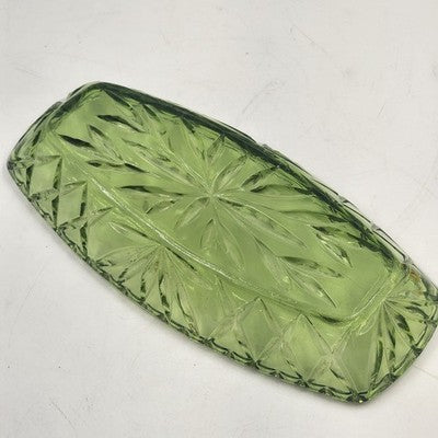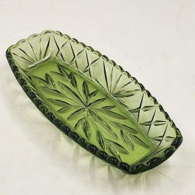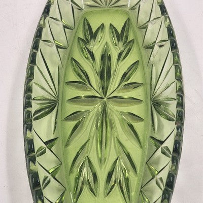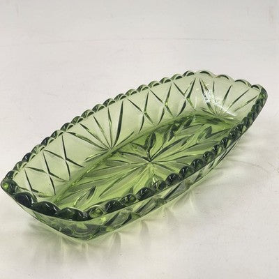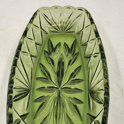 Hazel Atlas Oblong Relish Dish Green Glass Prescut Star & Scallop Edge 9.5"x4.5"