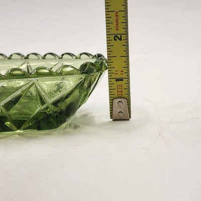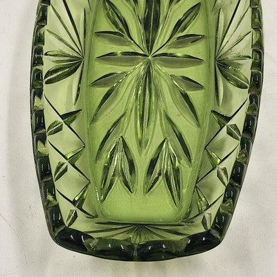 This vintage Hazel Atlas oblong relish dish features rich avocado green glass with an elegant prescut star motif and scalloped edge, making it perfect for serving appetizers, condiments, or as a charming display piece. A timeless addition to any glassware collection.