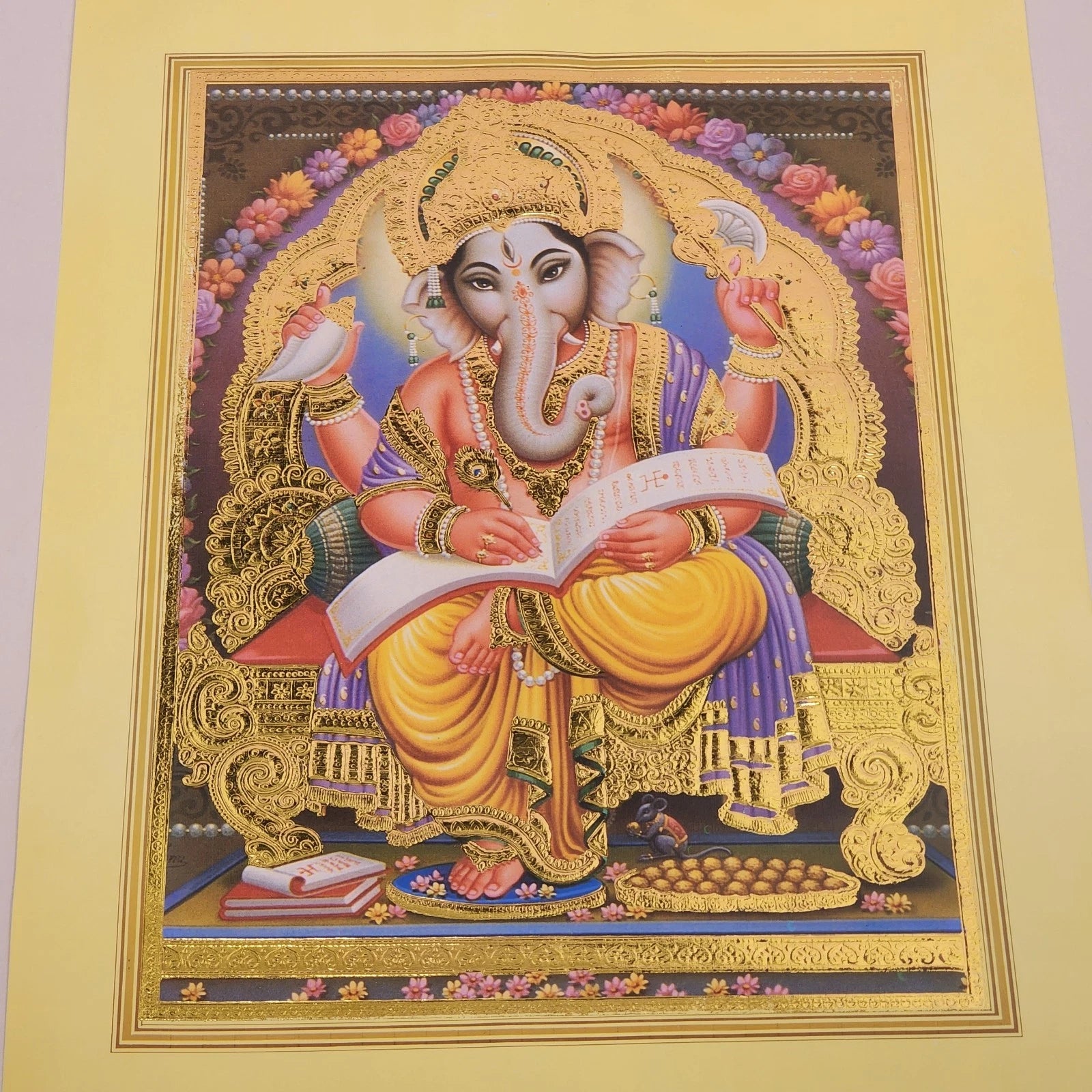 The print features vibrant colors and traditional iconography, including his elephant head, large ears (to hear the needs of the people), and his broken tusk-which, according to tradition, he used as a pen to record sacred texts.