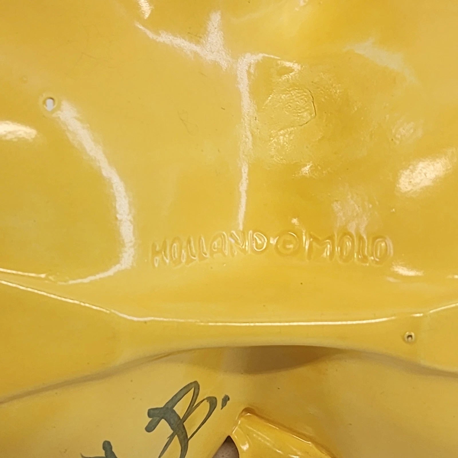 Brighten your home with this stunning mid-century divided serving dish, handcrafted from a 1962 Holland Mold. This piece features two elegantly sculpted hibiscus flowers in a vibrant sunny yellow, joined by a lush green leaf that serves as a central handle. The intricate detailing of the petals and the realistic veining on the leaf showcase the high-quality artistry of the era. Whether used to serve nuts and candies at a party or as a tropical-themed trinket dish for your vanity, this sculptural ceramic piece is a beautiful example of 1960s botanical decor.