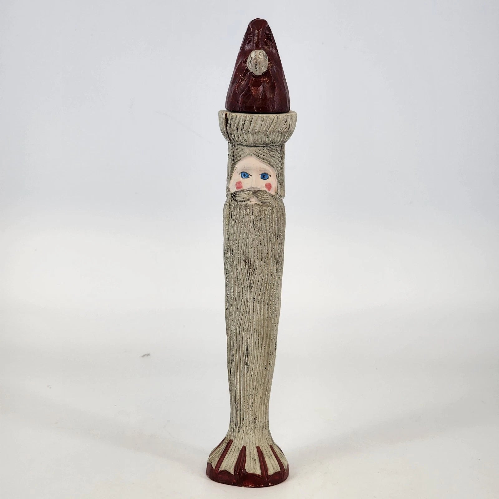 Add a touch of rustic charm to your holiday mantle with this unique vintage Santa Claus candle holder from House of Lloyd. Standing 11 inches tall, this narrow "Long Beard" Santa is carved from wood and features a hand-painted, folk-art aesthetic. A clever design detail includes a removable hat that reveals a slot for a standard taper candle. With his whimsical tall silhouette and traditional Country Kris style, this piece is perfect for a farmhouse Christmas display or as a centerpiece for a cozy holiday table.