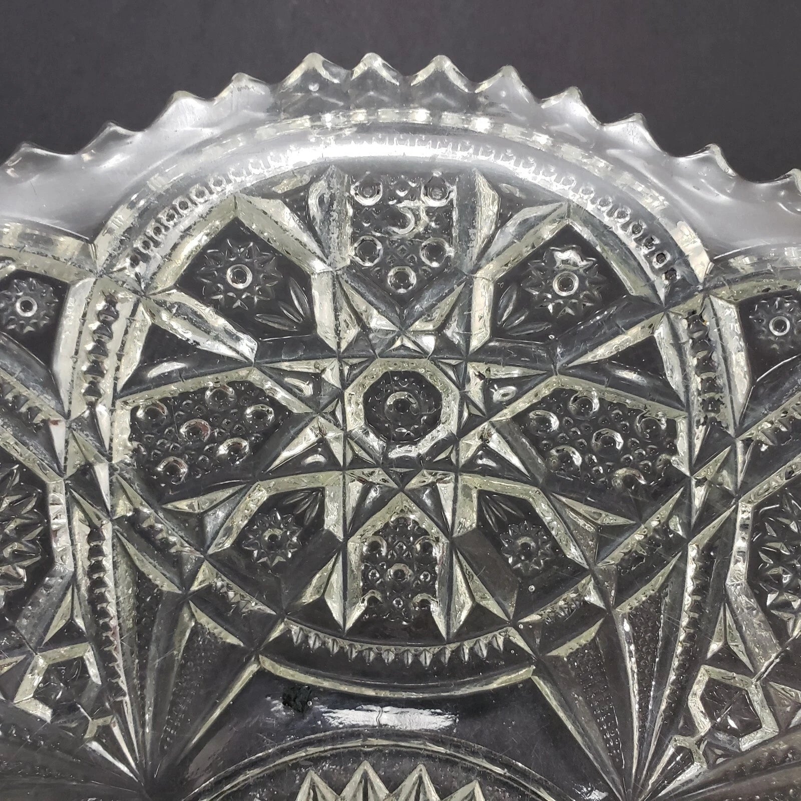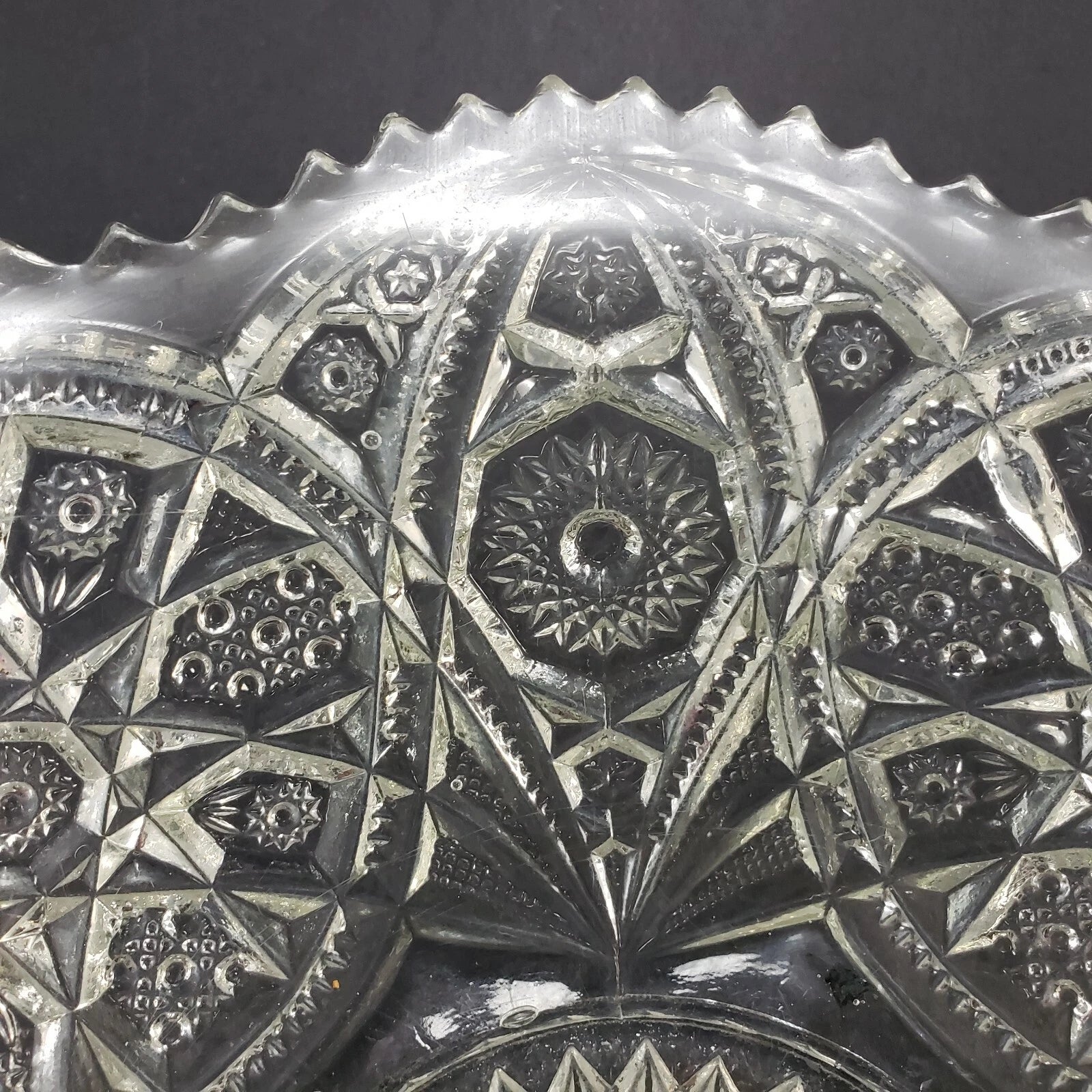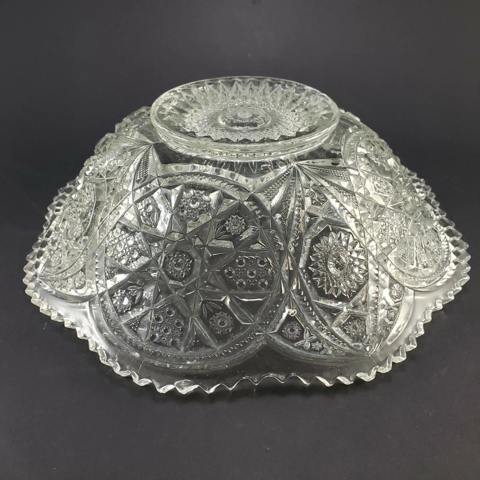 This vintage clear glass centerpiece bowl features the classic Hobstar and Criss-Cross pattern with a stunning sawtooth edge, characteristic of early 1900s glassware. Likely part of the Imperial Glass No. 388 "Wheels and Hobstars" Master Berry Bowl collection, first produced around 1909.