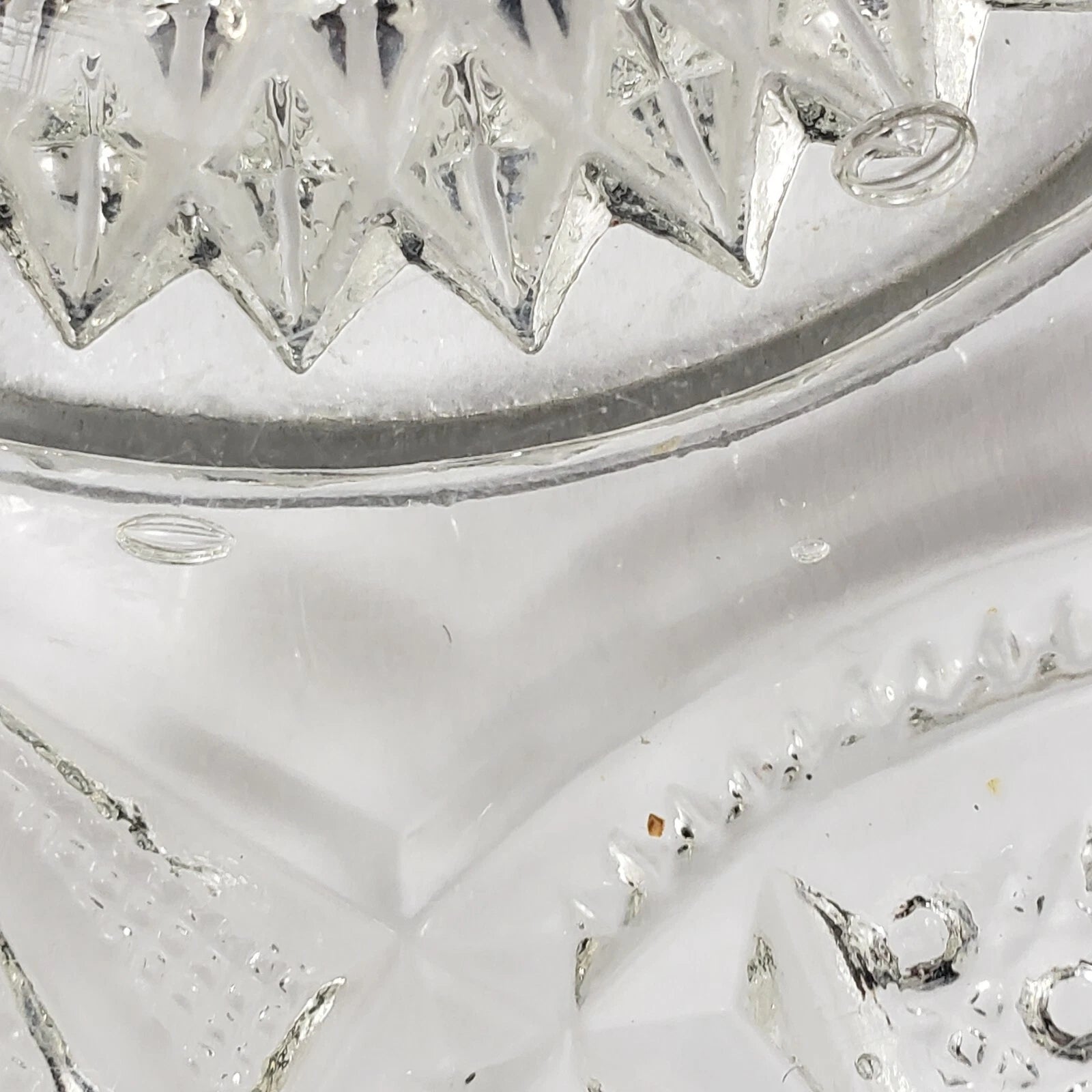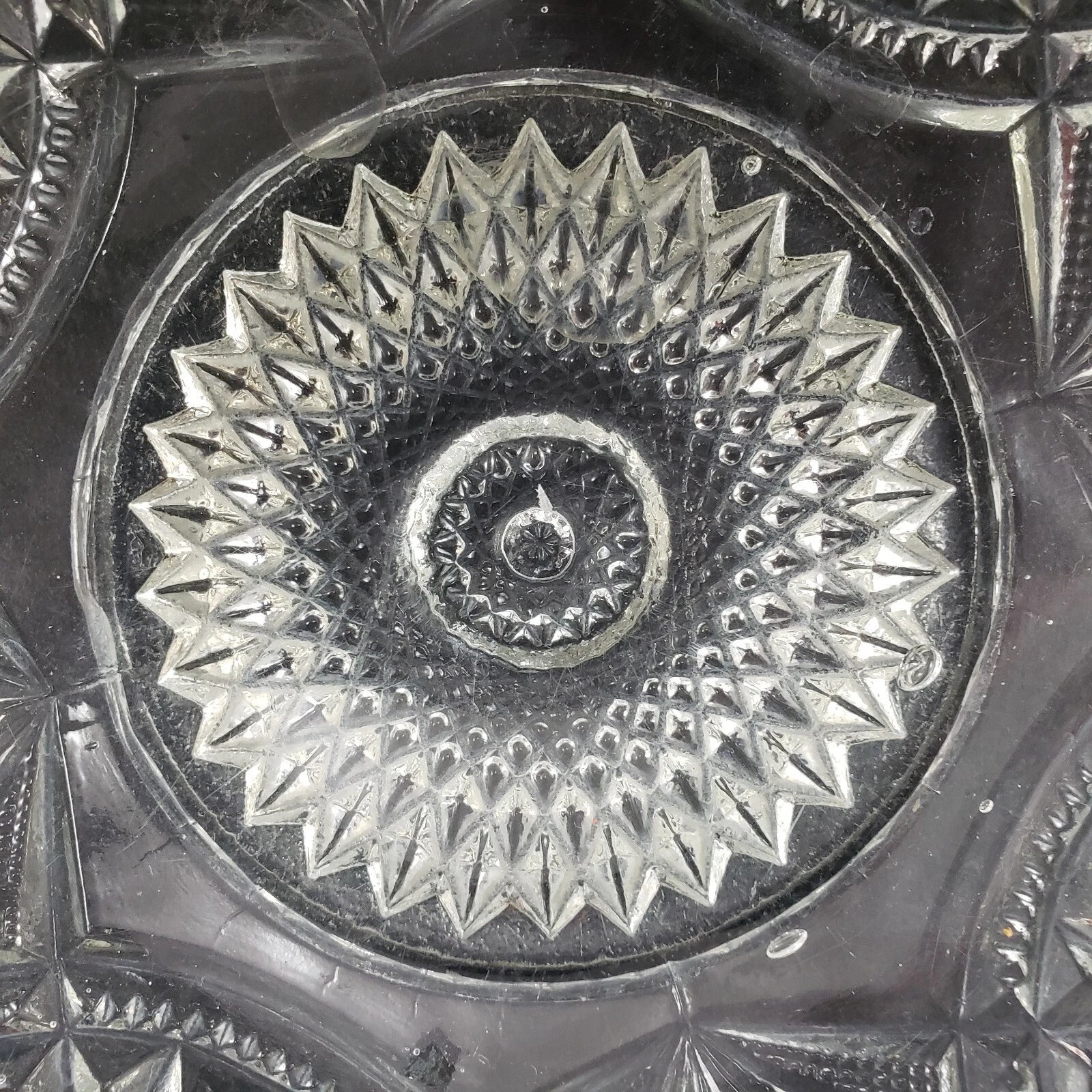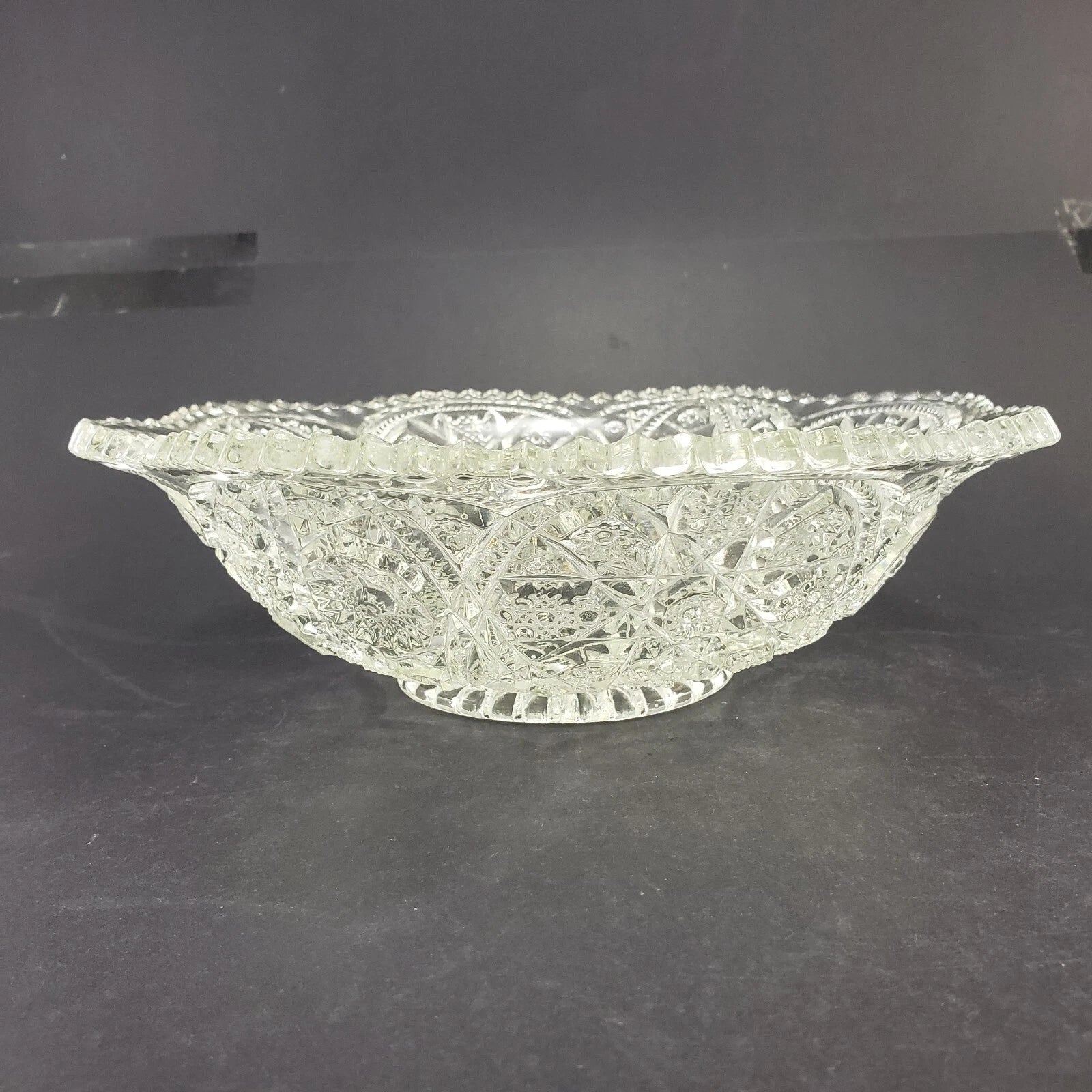 This vintage clear glass centerpiece bowl features the classic Hobstar and Criss-Cross pattern with a stunning sawtooth edge, characteristic of early 1900s glassware. Likely part of the Imperial Glass No. 388 "Wheels and Hobstars" Master Berry Bowl collection, first produced around 1909.