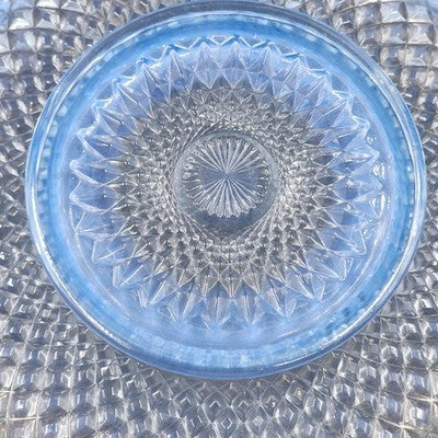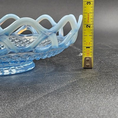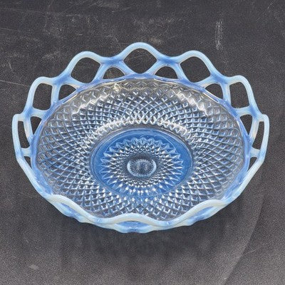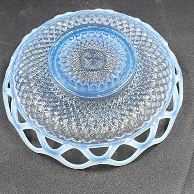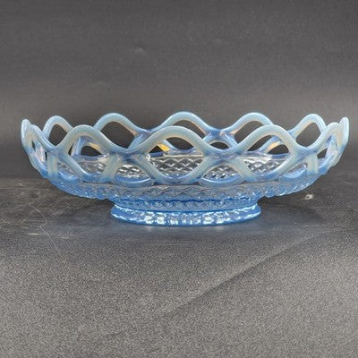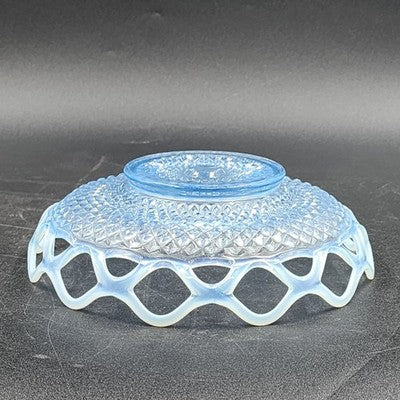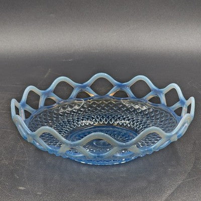 Add an elegant touch to your glassware collection with this Imperial Glass Katy bowl featuring a stunning blue opalescent finish and lace edge design. A beautiful example of vintage Depression glass, perfect for display or use.