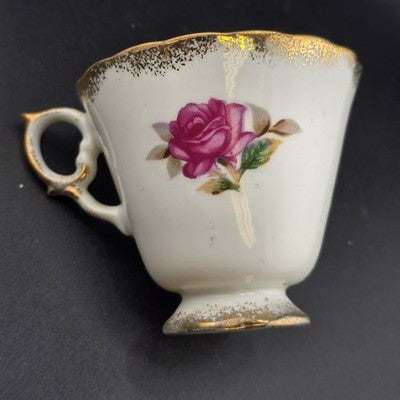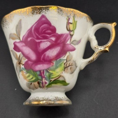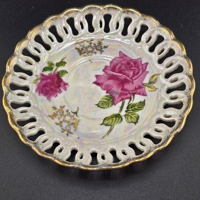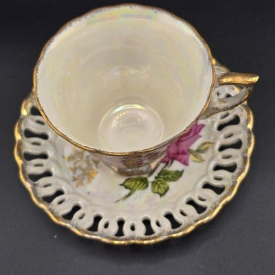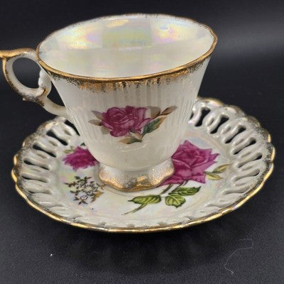 This vintage Inarco tea cup and saucer set with a lusterware design featuring roses and a reticulated edge is from Japan and dates back to 1955. The two-piece set is painted in a Victorian style with a delicate floral pattern, making it a limited edition collectible for tea enthusiasts. Crafted from fine china, this original set includes a cup and saucer, perfect for adding a touch of elegance to any tea-drinking occasion with its decorative handle and hand wash care instructions.