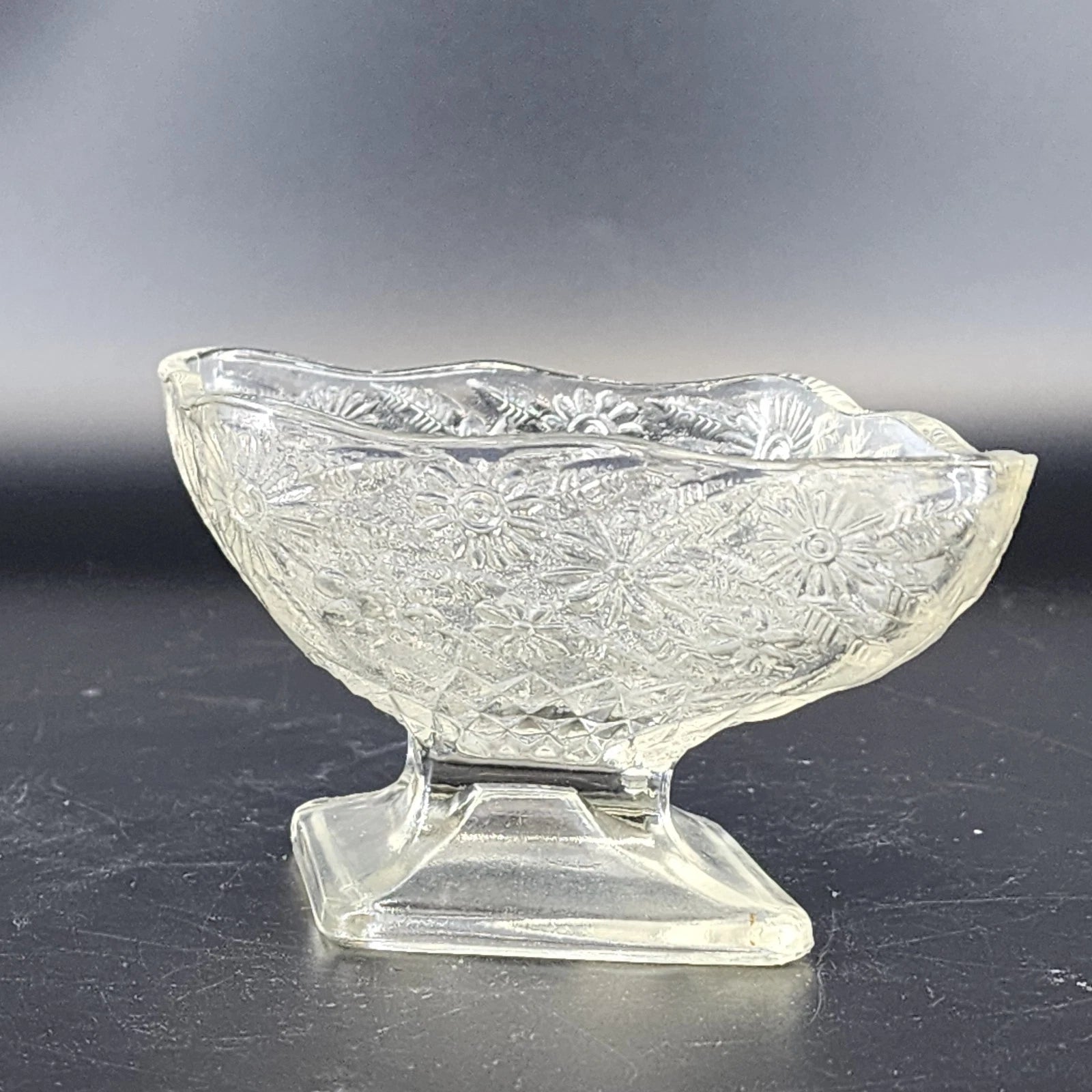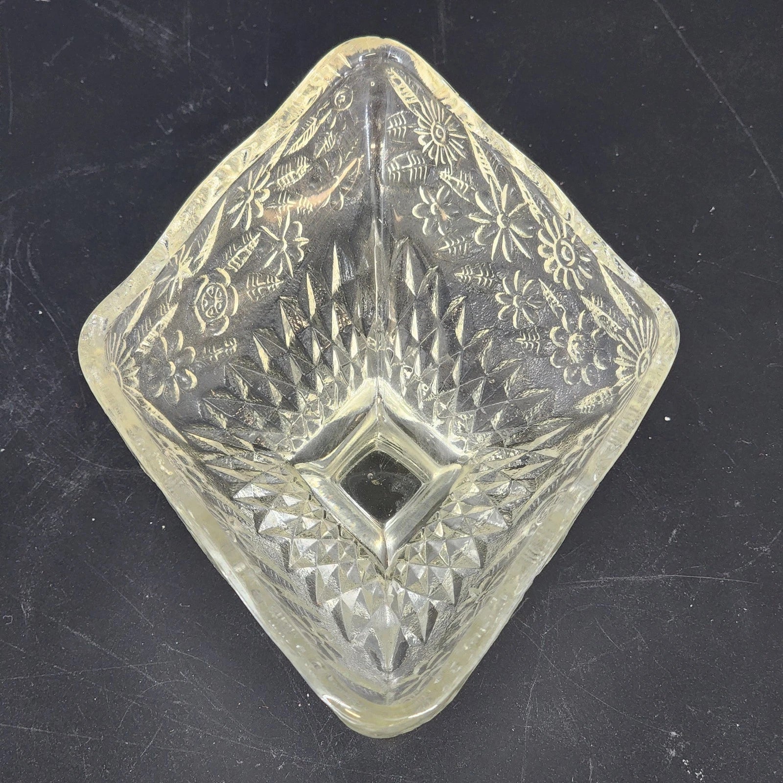Add a classic touch of Americana to your home with this vintage Indiana Glass compote. Featuring the beloved "Pineapple & Floral" (also known as Pineapple Daisy) pattern, this clear pressed glass piece boasts a unique diamond-shaped bowl set atop a sturdy pedestal base. The intricate design combines textured pineapple motifs with delicate floral accents, a pattern that remained popular from the Depression era through the late 20th century. While it shows a small flea bite chip on one end, it remains a sparkling and functional piece for serving candy, nuts, or simply as a beautiful catch-all on a sideboard.