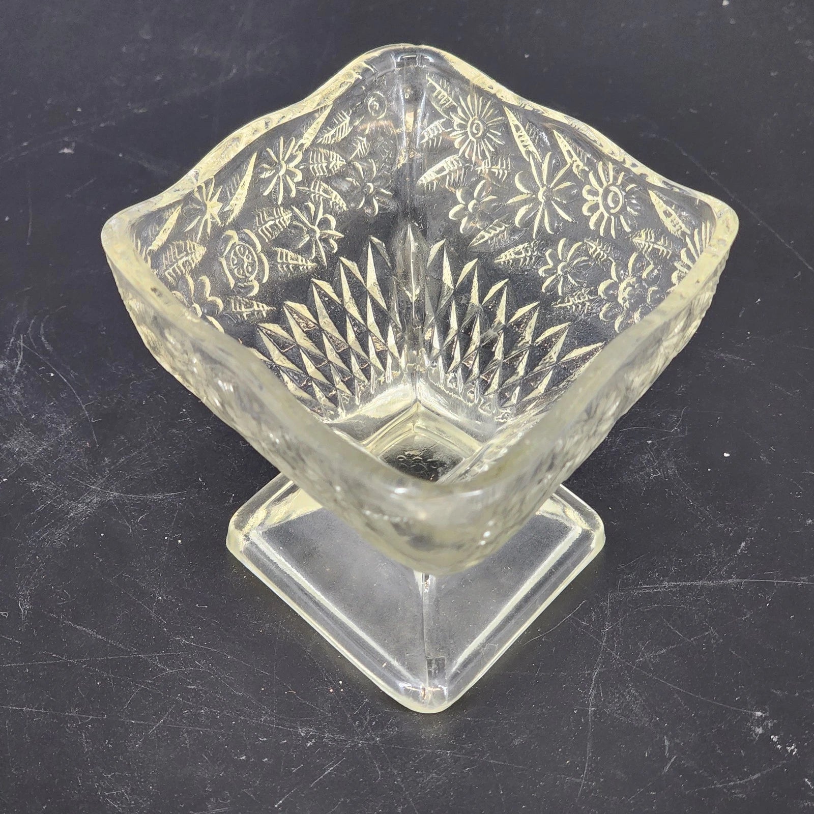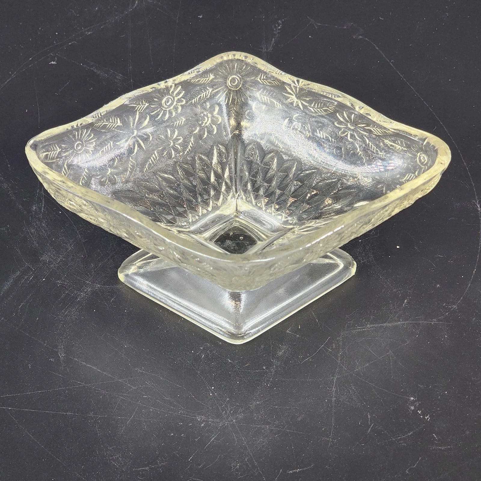 * Design: Diamond-shaped bowl with a pedestal base