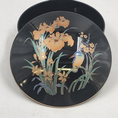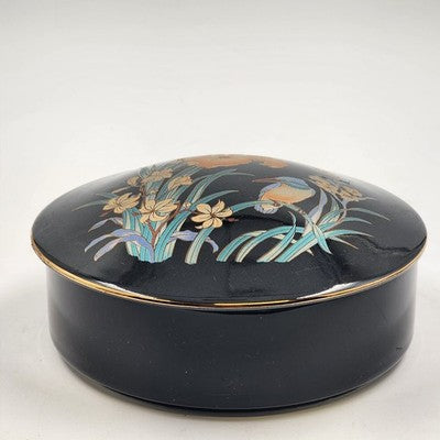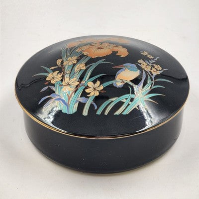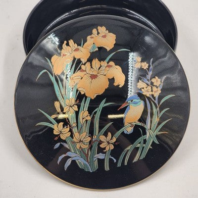 Japan Ceramic Trinket Pot Box 6" Black Gold Gilt Bird & Flowers Ring Box