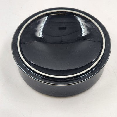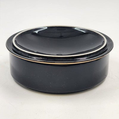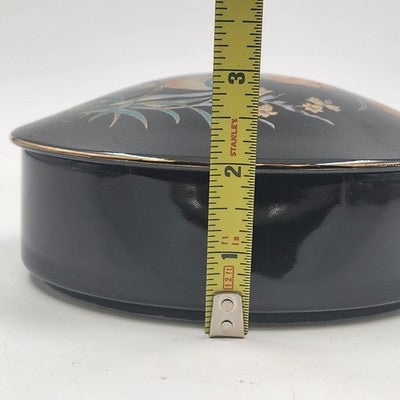 Add elegance to your vanity or dresser with this vintage ceramic trinket box from Japan, beautifully finished in black with gold gilt detailing. The lid features a delicate bird and floral motif, making it perfect for storing rings, jewelry, or other small treasures.