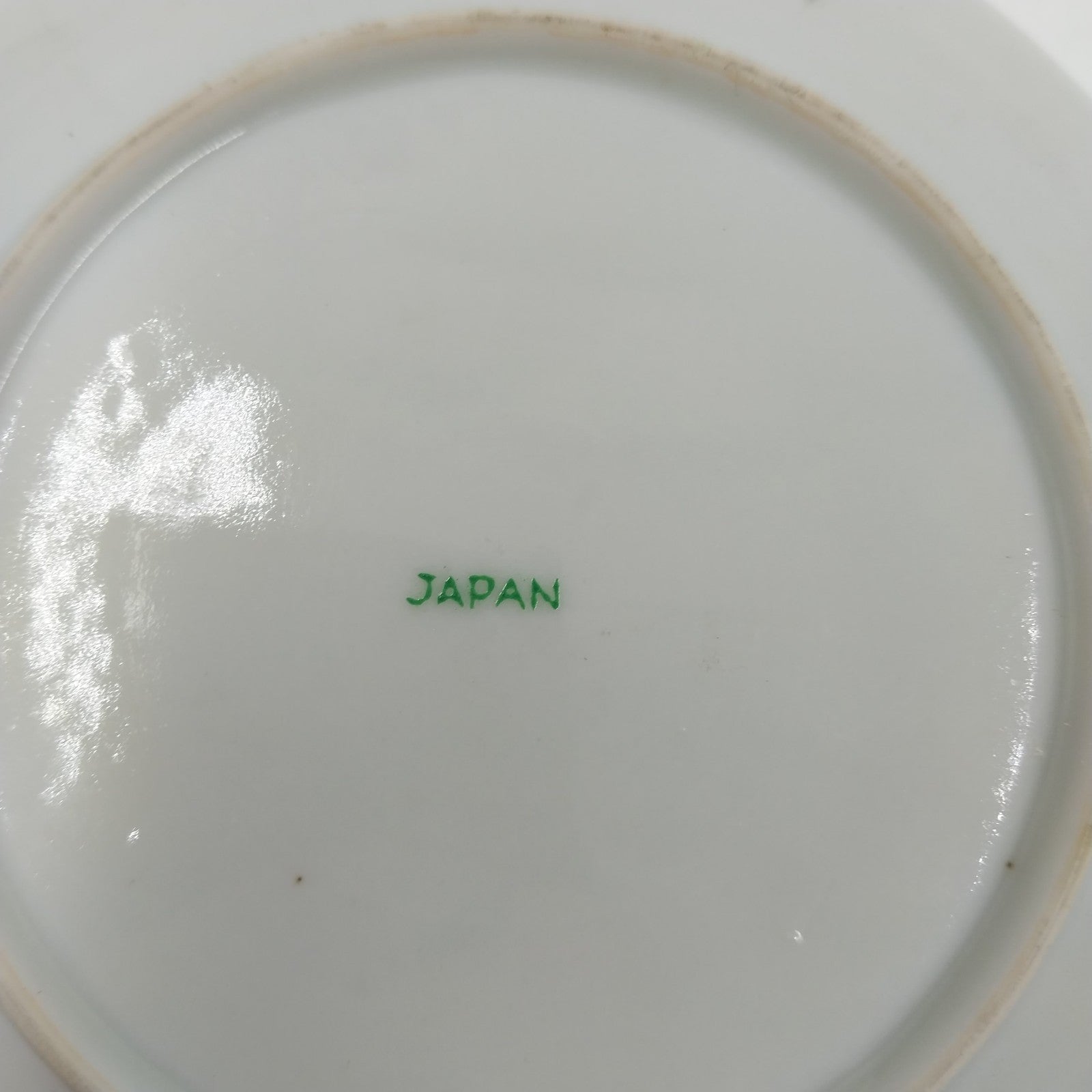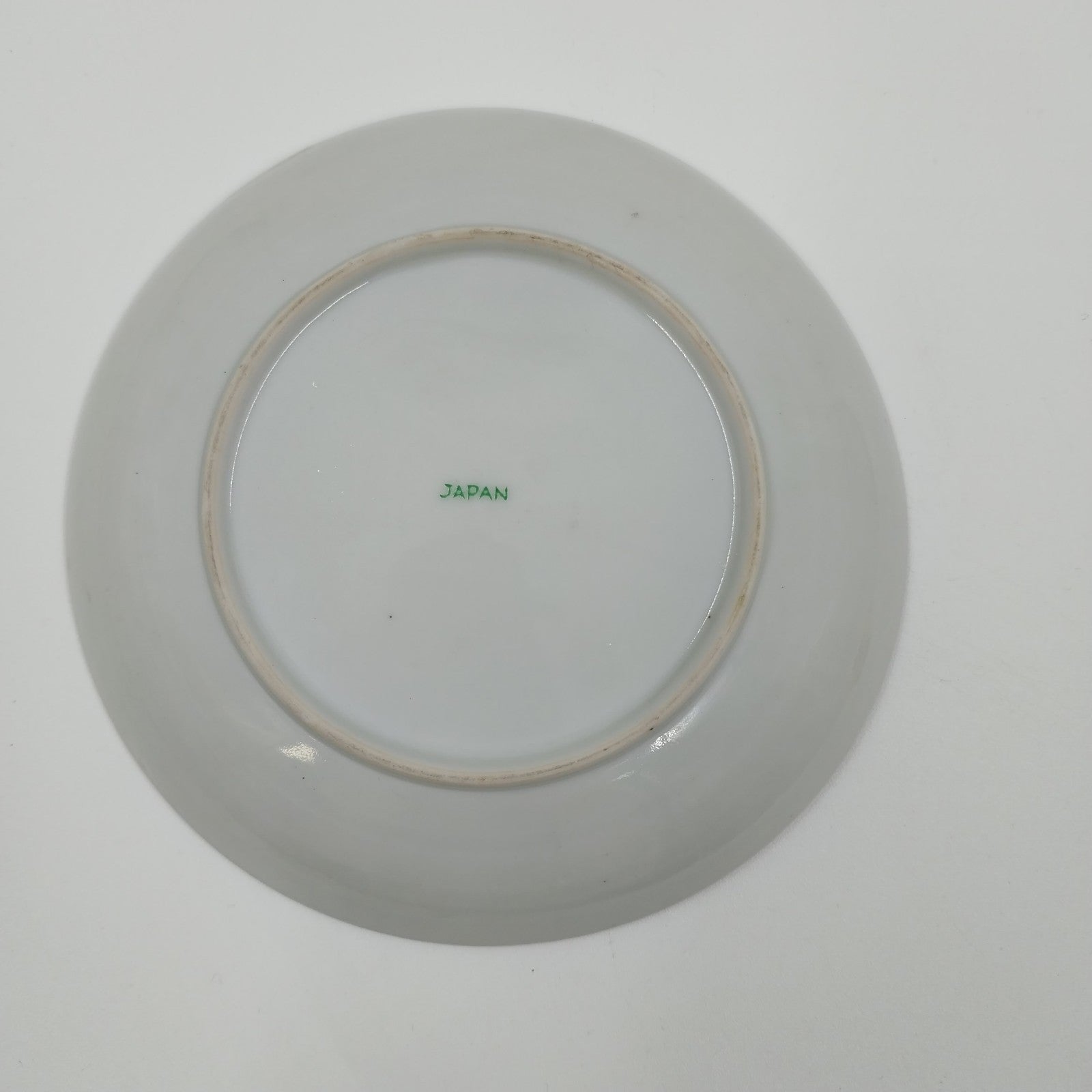 Vintage Japanese Moriage Porcelain Hand-Painted Saucer featuring an elegant floral design in pink, green, and purple hues. The saucer showcases intricate raised Moriage detailing and is a beautiful example of Japanese craftsmanship. Measuring approximately 6 inches, this vintage piece is perfect for collectors or as a decorative accent.