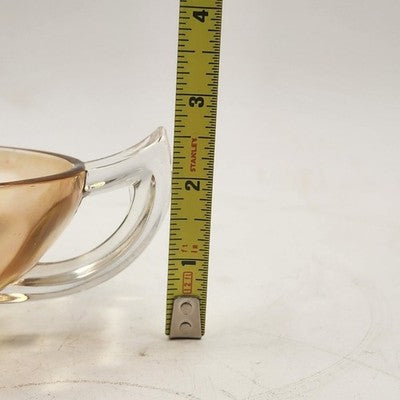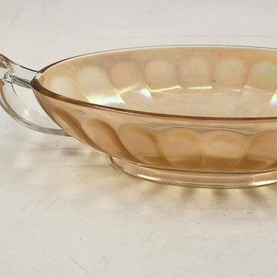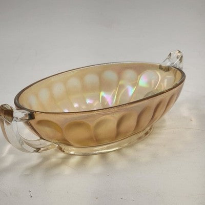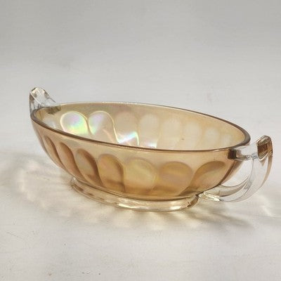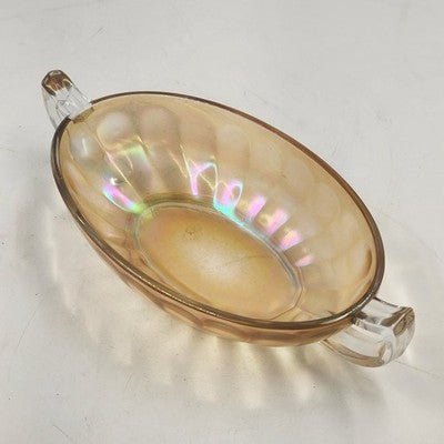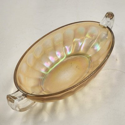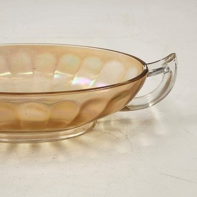 This vintage Jeannette Carnival Glass bowl boasts a rich iridescent marigold hue with twin clear glass handles, combining beauty and function. Perfect as a serving dish, centerpiece, or collectible display piece, it showcases the timeless craftsmanship of Jeannette Glass.